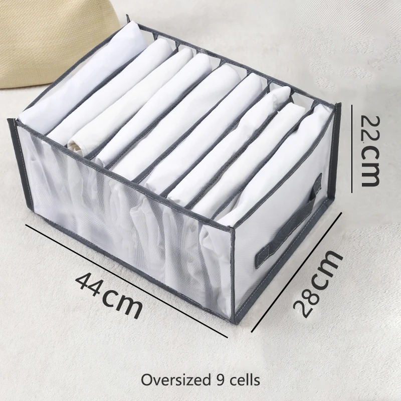 1. Ponadgabarytowe 9 siatek (długość 44x szerokość 28x wysokość 22cm): może pomieścić 9 sztuk cienkich wełnianych swetrów lub grubych spodni.