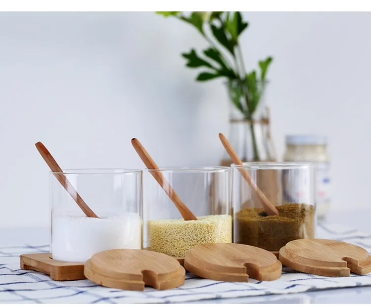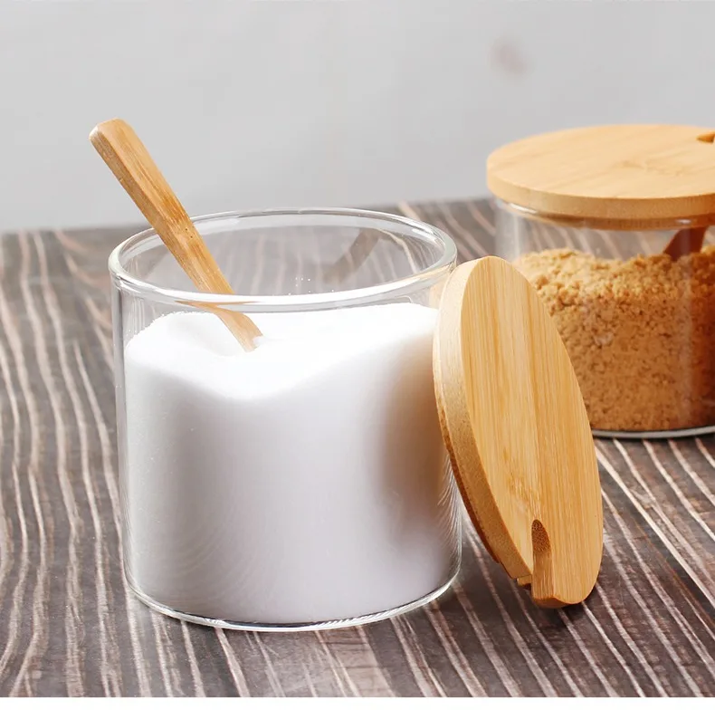 Europejski styl kuchnia szklany zestaw słoików na przyprawy sól cukrowa przyprawa słoik z drewnianą łyżeczka w pokrywce przyprawa narzędzie pojemnik na przyprawy