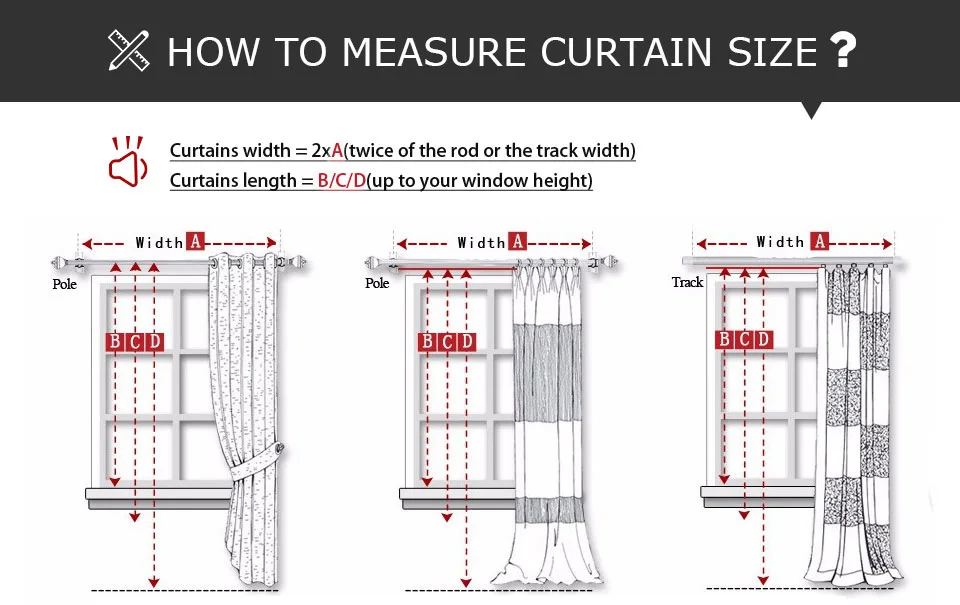 Szerokość zasłon = 2xA (2 sztuki pręta lub szerokość toru). Dla całego okna dwa panele są lepsze.