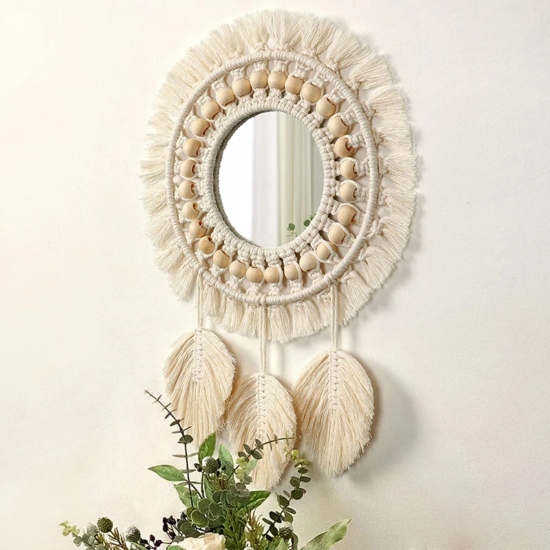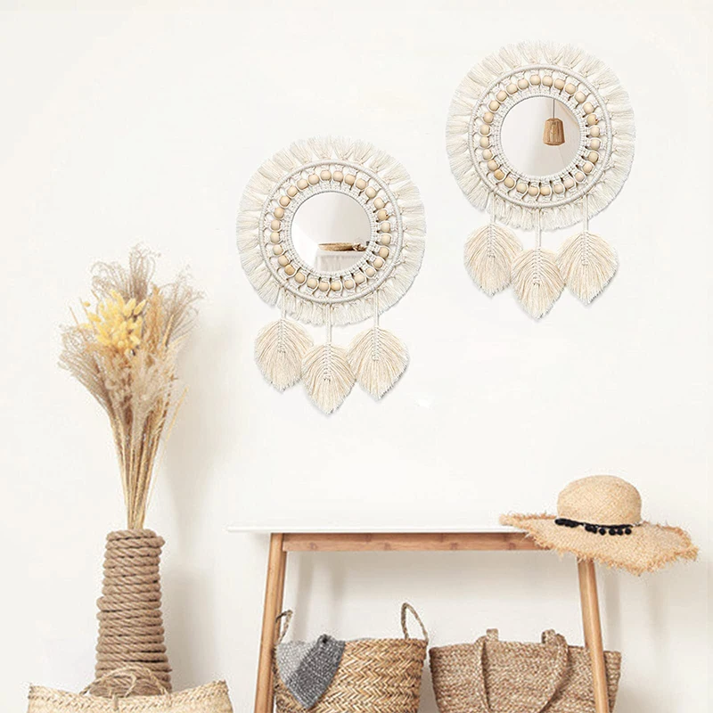 【Materiał wysokiej jakości】 wykonany z bawełny, drewnianych koralików i lustra, trwały, odporny na zużycie i przyjazny dla środowiska, bardzo delikatny i praktyczny. Lustro w kształcie sunburst tkane. Znakomity proces tkania, elegancki i elegancki.