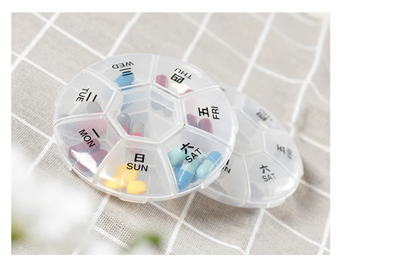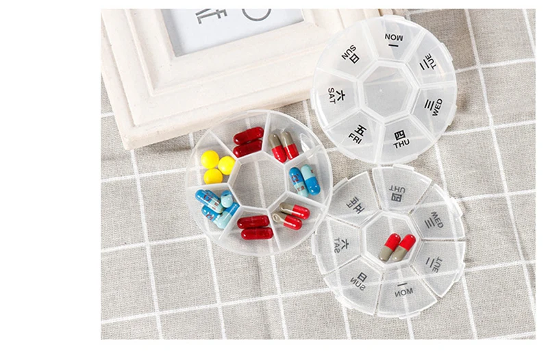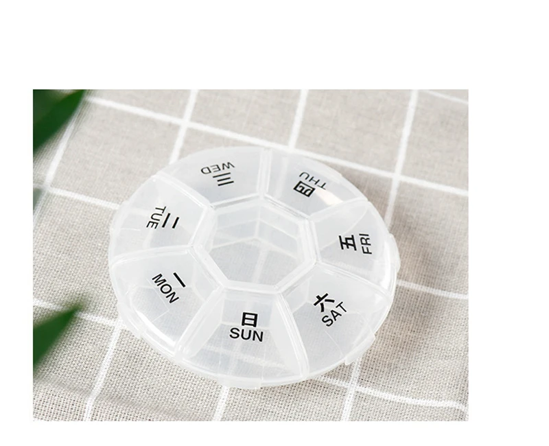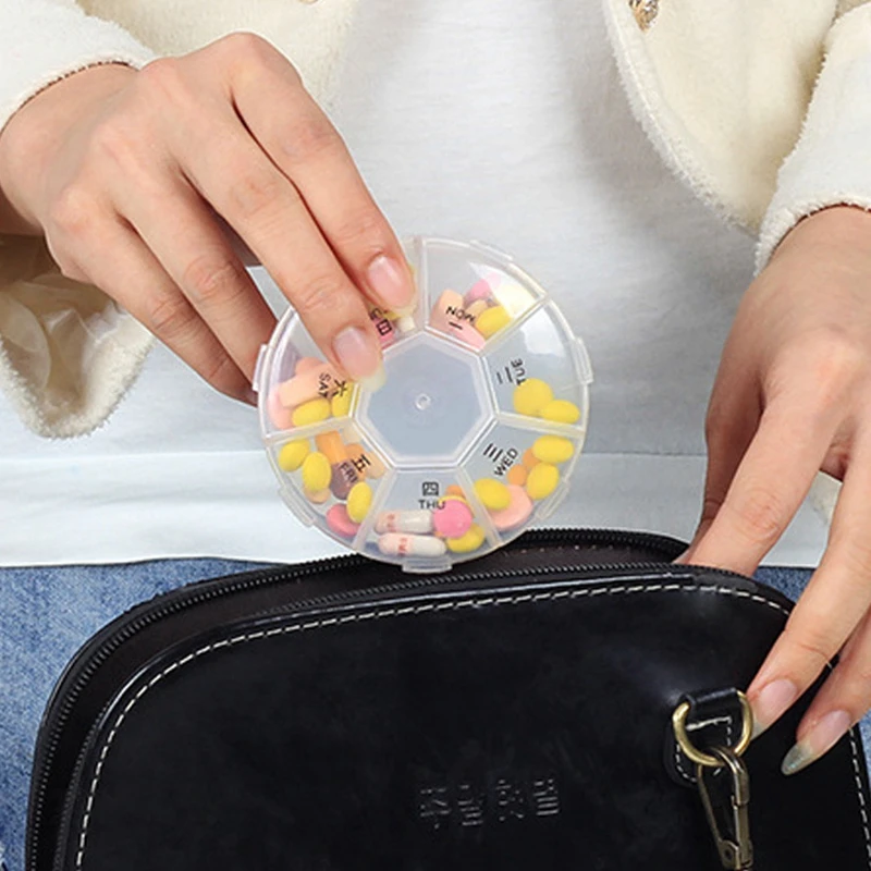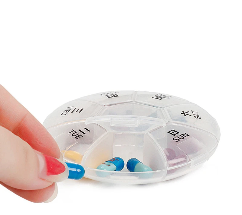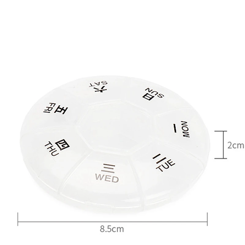 Okrągłe pudełko na pigułki 7 gniazd okrągłe codzienne tygodniowa porcja tabletek futerał na pigułki Splitter medycyna Pil Case Geneeskunde Houder Organizer dozownik