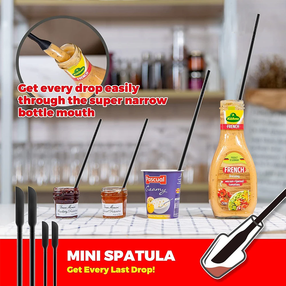 3: mała silikonowa szpatułka jest zaprojektowana z długim uchwytem i wąską główką, pozwala jej sięgać głęboko do dna butelki bez marnowania ostatniej kropli. Mini szpatułka dobrze pasuje do różnych pojemników, słoików i butelek, szczególnie dla osób z chudymi otworami. Elastyczność głowy, które można łatwo ominąć krzywe i narożniki pojemnika, zaoszczędzić czas i pieniądze.
