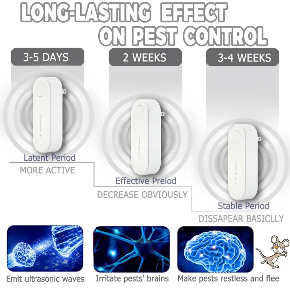 Odstraszający efekt odstraszający 3 w 1 z potrójnym ultradźwiękowym zakresem częstotliwości-ultradźwięki, fala piłokształtna i fala bioniczna, zwiększają jego siłę, aby usunąć wszystkie szkodniki wewnętrzne o wartości 800-1800 ft². A fala jest 360 stopni wokół zasięgu, niech myszy i inne szkodniki nie mają gdzie się ukryć.