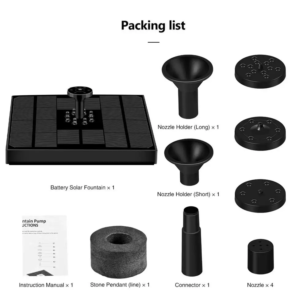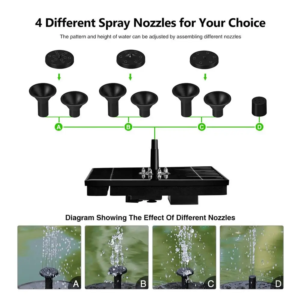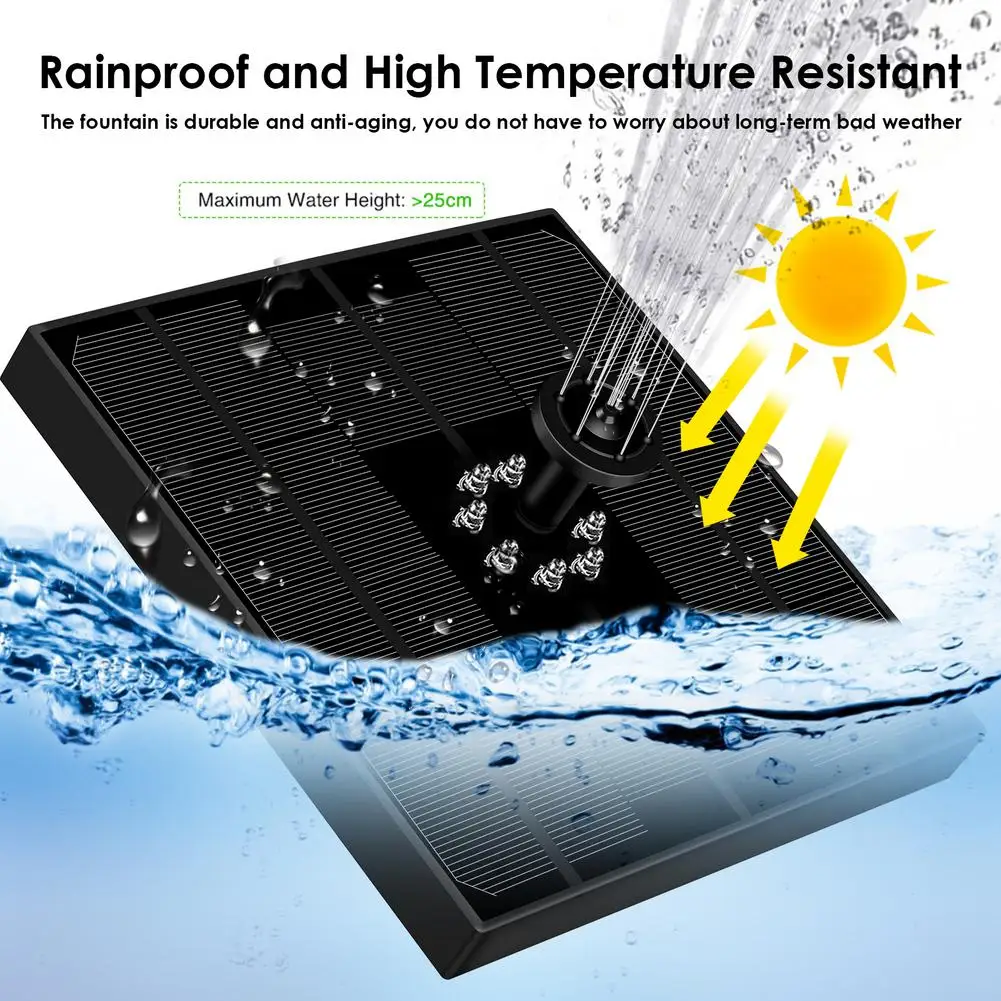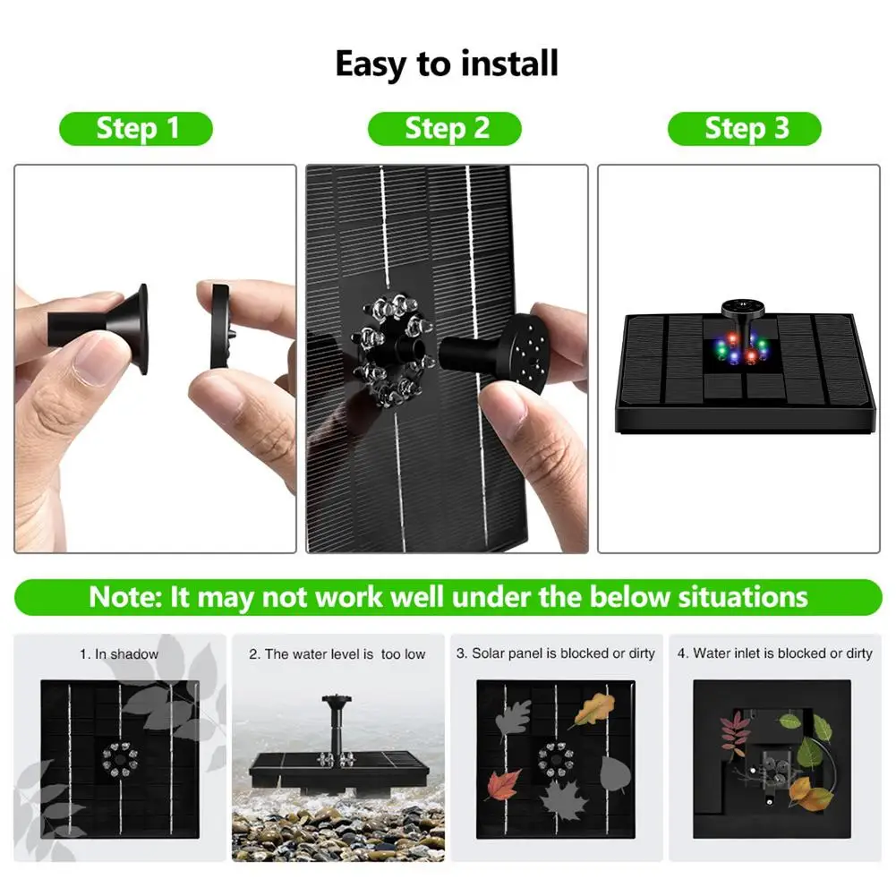 1. Wysokość strumienia wody tego produktu zależy całkowicie od siły słońca. Gdy słońce jest słabe, pompa nie będzie działać w sposób ciągły, ale automatycznie rozpocznie się wielokrotnie, aż słońce osiągnie określoną intensywność, a pompa wznowi ciągłą pracę. Podczas używania należy umieścić produkt w niezakłóconym świetle słonecznym. Cieniowanie wpłynie na normalną pracę pompy.