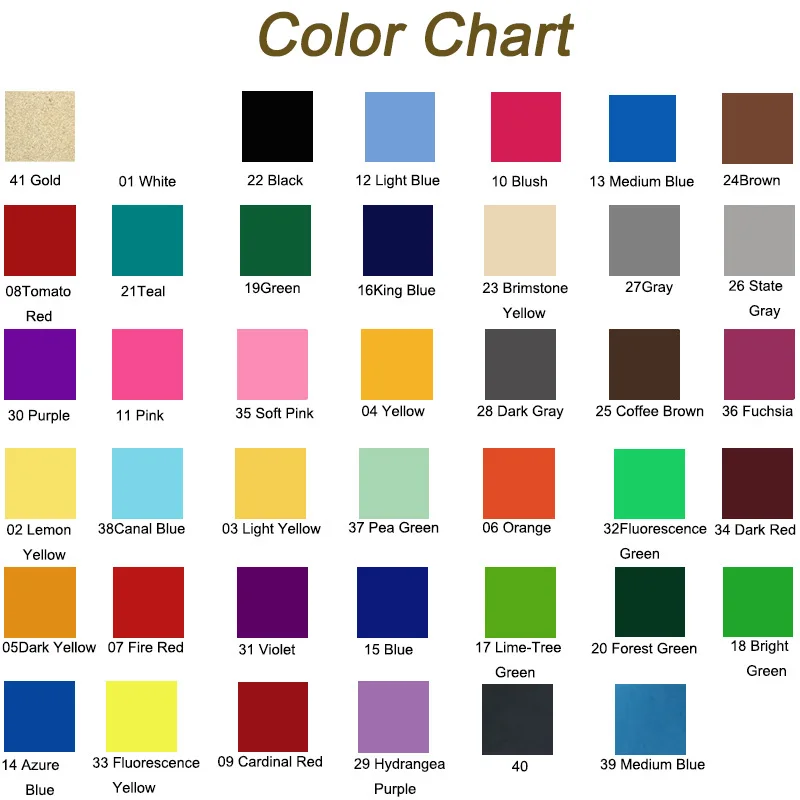 01 white04 Yellow08 Tomato Red10 Blush11 Pink12 Light Blue13 Medium Blue16 King Blue19 Green21 Teal22 Black23 Brimstone Yellow24 Brown25 Coffee Brown26 State Gray27 Gray28 Dark Gray30 Purple35 Soft Pink36 Fuchsia41 GoldOther color choose