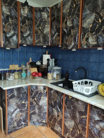 Błyszcząca marmurowa tapeta: wskazówki-czyste liczniki z ręcznikami. Po zakończeniu umieszczania nowej osłony licznika, uszczelnij szwy między backsplash a ladą. Wygląda bardziej realistycznie i obejmuje każdy licznik, który może być widoczny. Łatwe do czyszczenia przez wilgotną szmatkę.