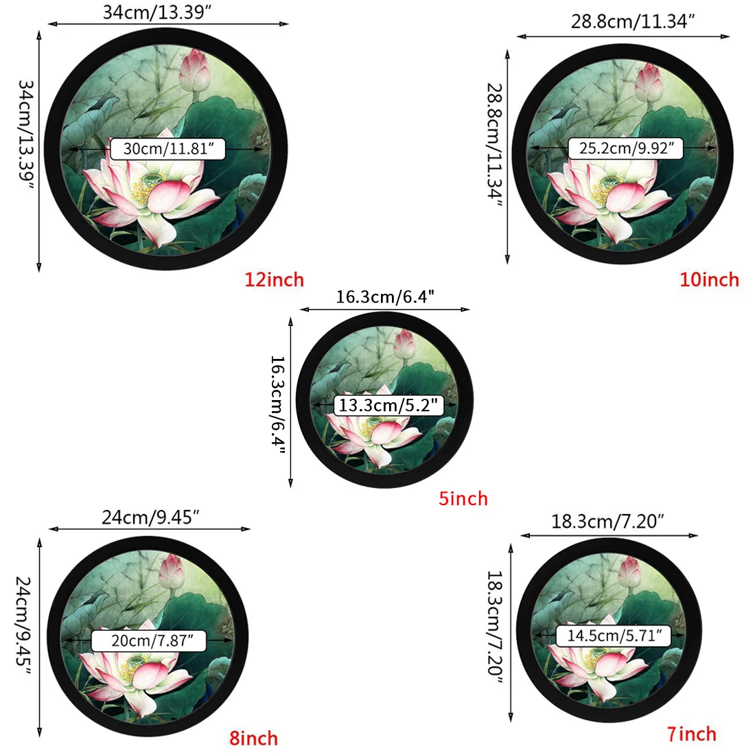 7 cali: zewnętrzna średnica ramy: 18.3cm, wewnętrzna średnica ramy: 14.5cm,