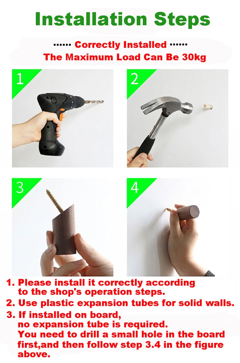 Instalacja: wywierć śrubę rozprężną w ścianie za pomocą wiertarki elektrycznej lub innego narzędzia, a następnie wkręć drewniany hak do ściany.