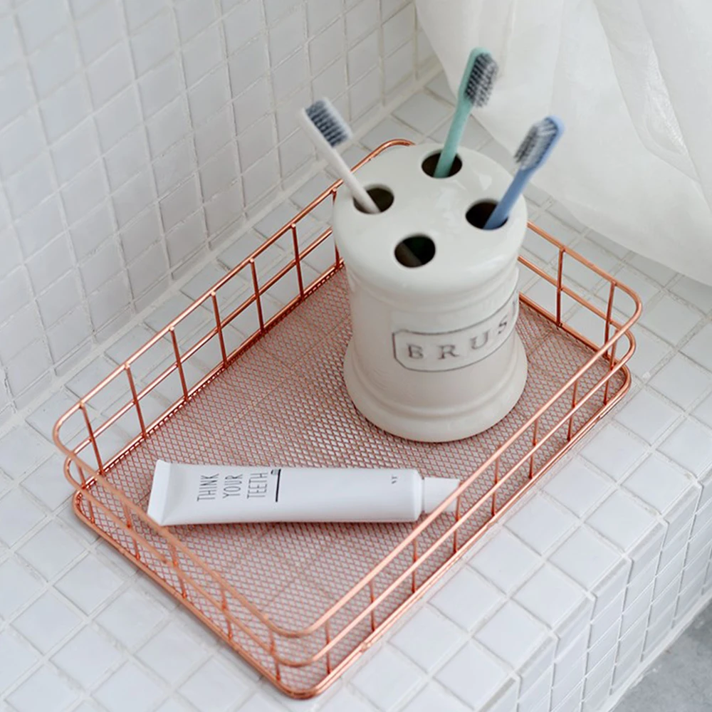 Nordic różowe złoty Metal druciany kosz do przechowywania biura na biurko rozmaitości uchwyt na pędzle do makijażu tabeli Organizer na kosmetyki żelazny koszyk