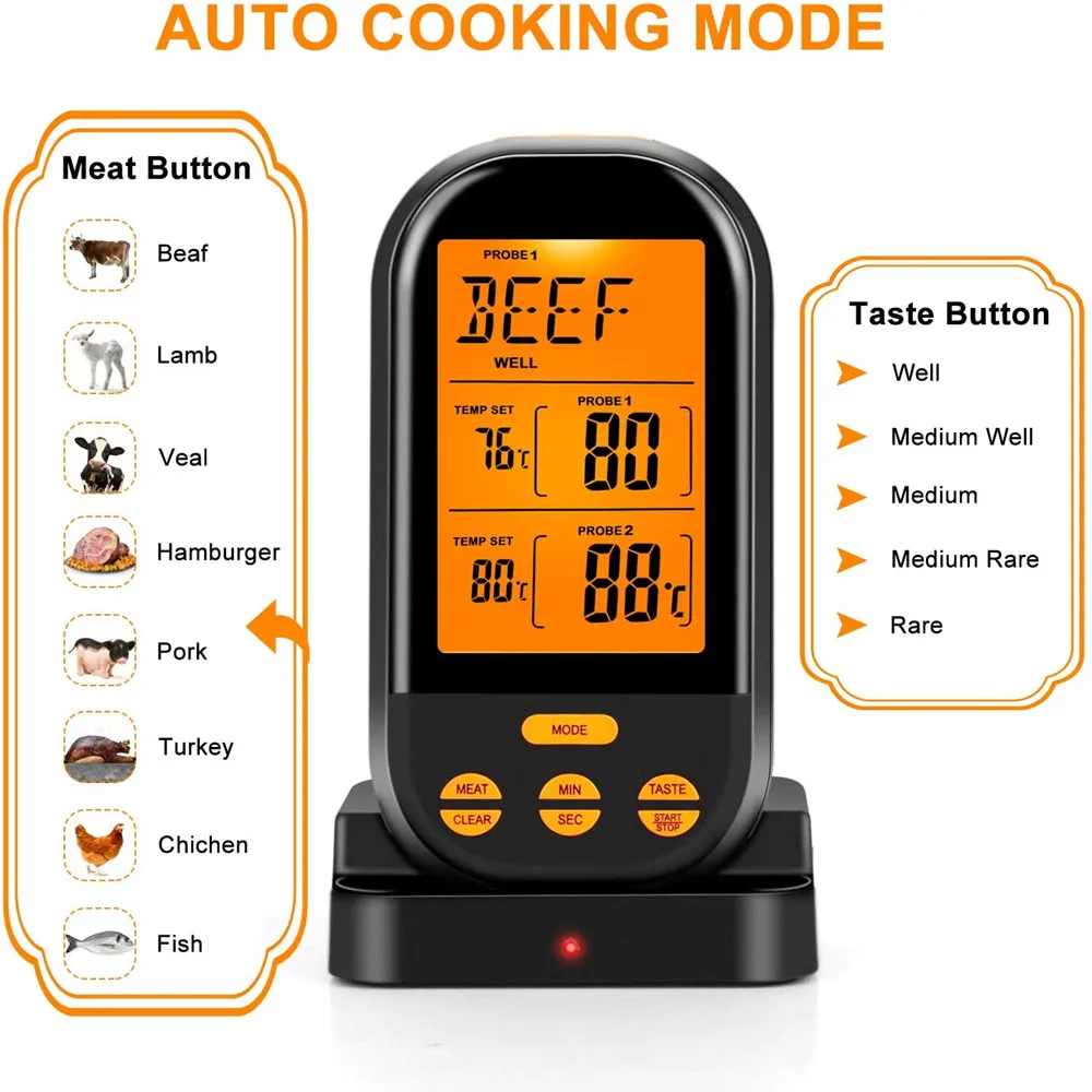 4. [Konstrukcja podwójnej sondy i różnorodność zastosowań] Probe1 do testowania temperatury żywności, istnieje zbudowany w 8 różnych programach spożywczych do wyboru (wołowina, jagnięcina, cielęcina, HAMBURGER, wieprzowina, indyk, kurczak, ryby) i 5 różnych poziomów donencji (rzadkie, średnie rzadkie, średnie, średnie lub dobrze) Sonda 2 do testowania temperatura pieca.