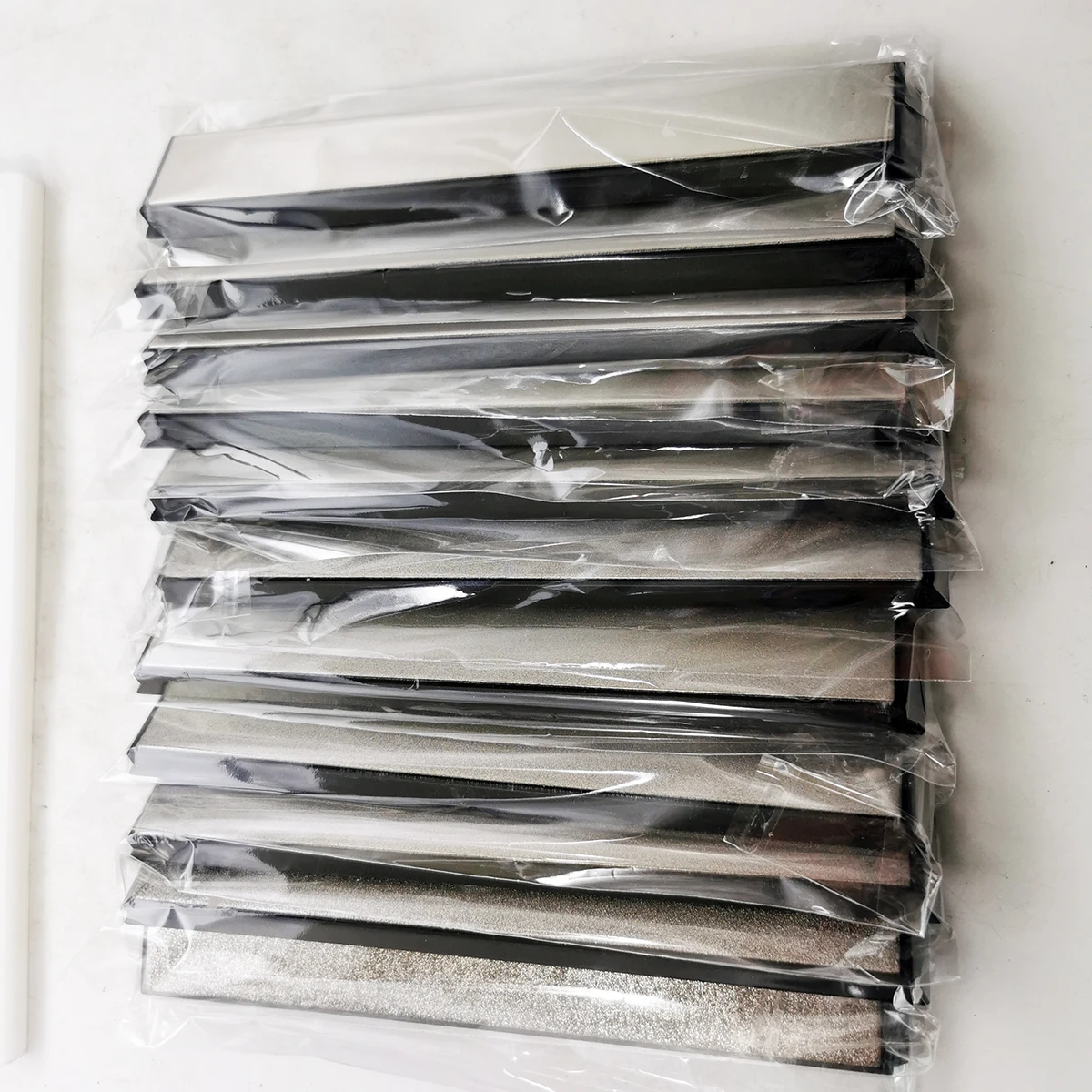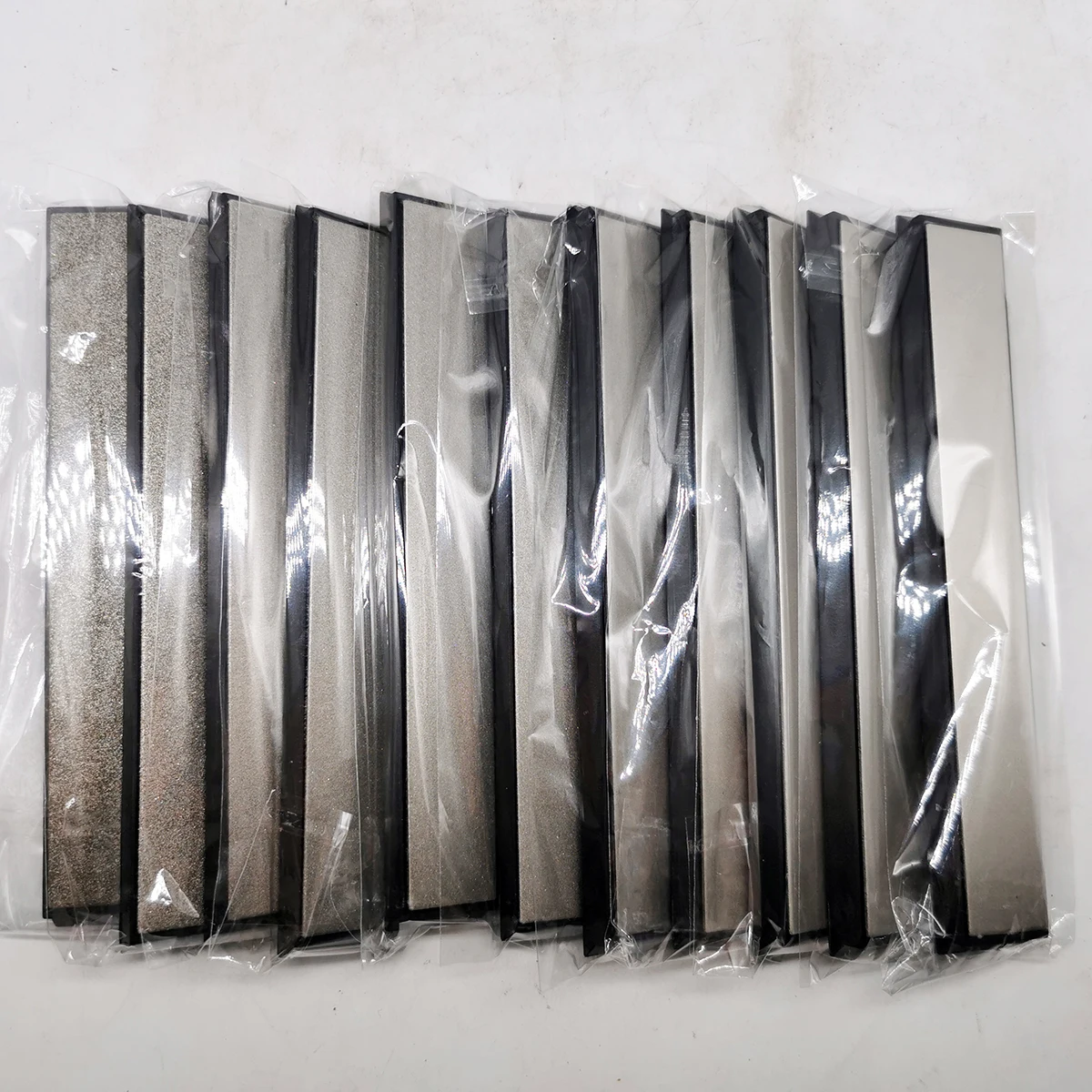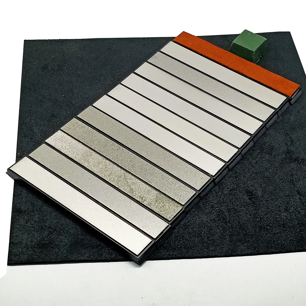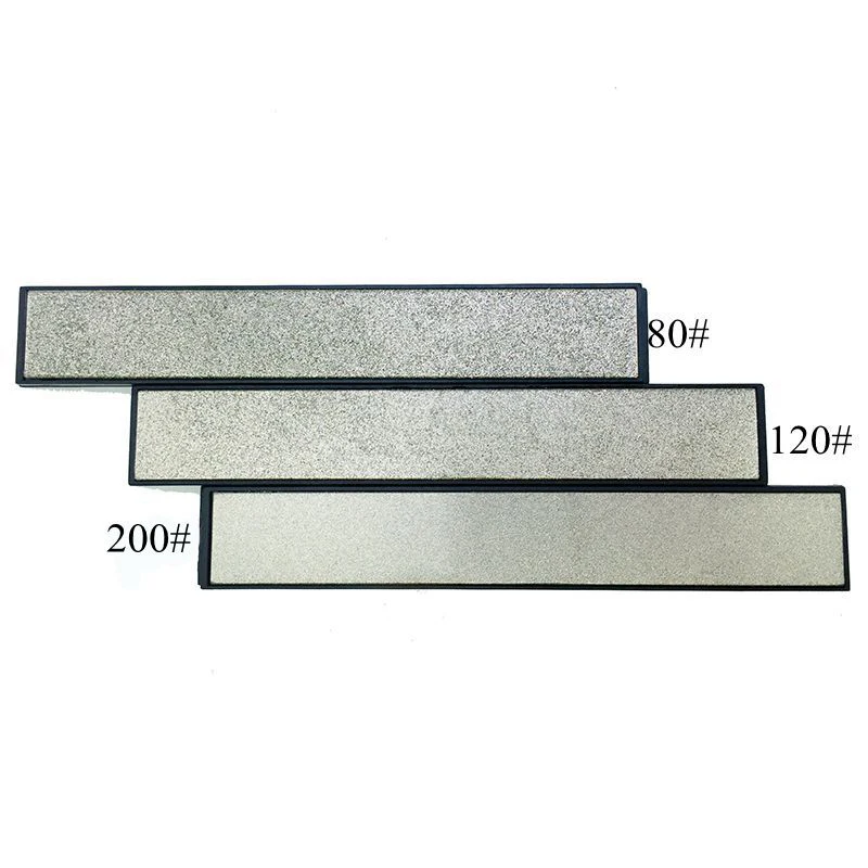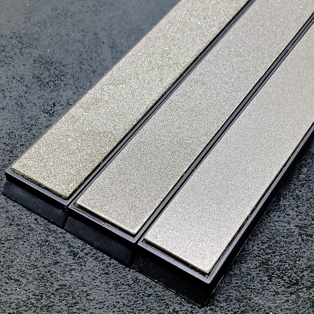 Płyty diamentowe na wiązaniu galwanicznym zapewniają intensywne usuwanie metalu i mogą być używane do krawędzi skrawającej ze znacznymi uszkodzeniami (wióry, zgięcia itp.). Płytka na diamenty F80-120 bardzo gruba służy do zgrubnego szlifowania krawędzi i formowania kształtu ostrza. Płytka na diamenty F200-400 gruba służy do formowania krawędzi skrawającej. Płytka na diamenty F500-600 Medium służy do głównych operacji ostrzenia i tworzenia agresywnego cięcia. Płytka na diamenty F800-1000 grzywny służy do wstępnego wykończenia krawędzi skrawającej i usuwania zauważalnych śladów. Płytka na diamenty F1500-3000 bardzo cienka służy do wykończenia krawędzi skrawającej. Działają znacznie bardziej agresywnie niż kamienie na wiązaniu organicznym lub metalicznym o tej samej wielkości ziarna. Osiąga się to dzięki wystającym ziarnom diamentu, podczas gdy grais w wiązaniu organicznym lub metalicznym zasysa spoiwo i miesza się z nim. Stężenie ziarna w warstwie wynosi 100%. Chociaż należy zauważyć, że kamienie te ulegną innym kamieniom w czasie pracy z powodu cienkiej powłoki, która aktywnie usunie podczas ostrzenia. Należy również pamiętać, że dzięki pracy z stalami miękkimi (do 58 HRC) te kamienie diamentowe będą działać szybciej niż dzięki pracy z twardszymi stalami. Kamienie diamentowe na wiązaniu galwanicznym nie wymagają przygotowania do pracy (poziomowanie, „doping up” itp.). Wymiary ścierne: 4х20х150mm