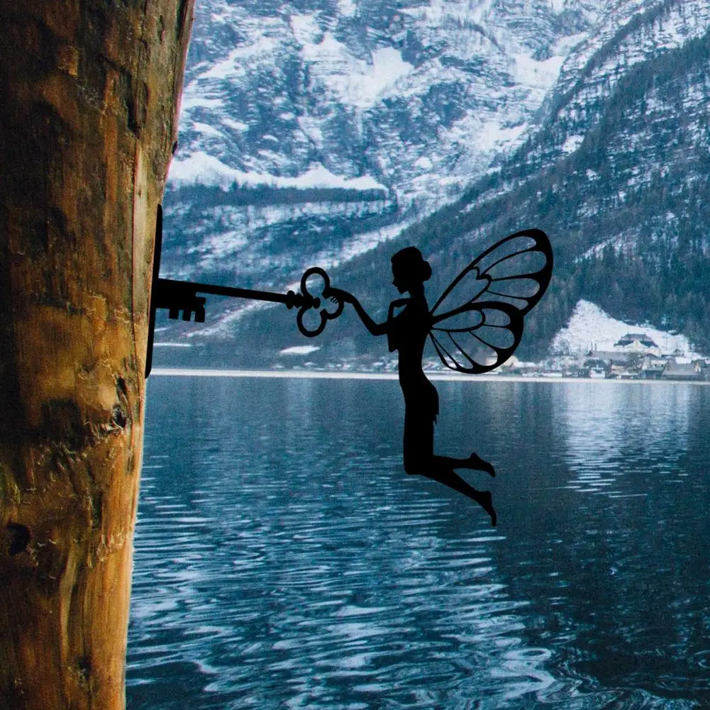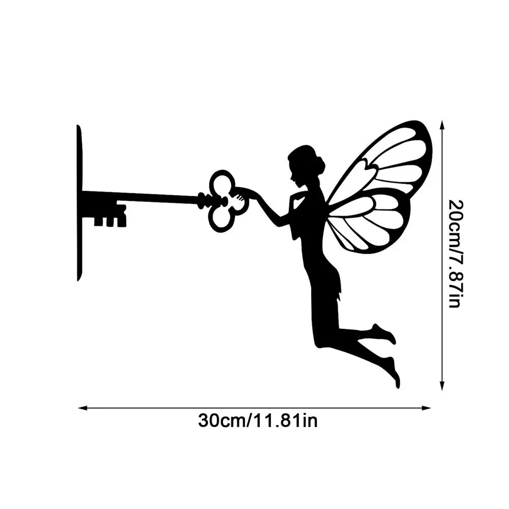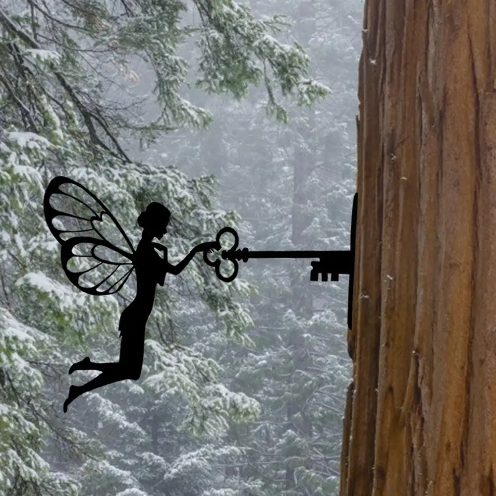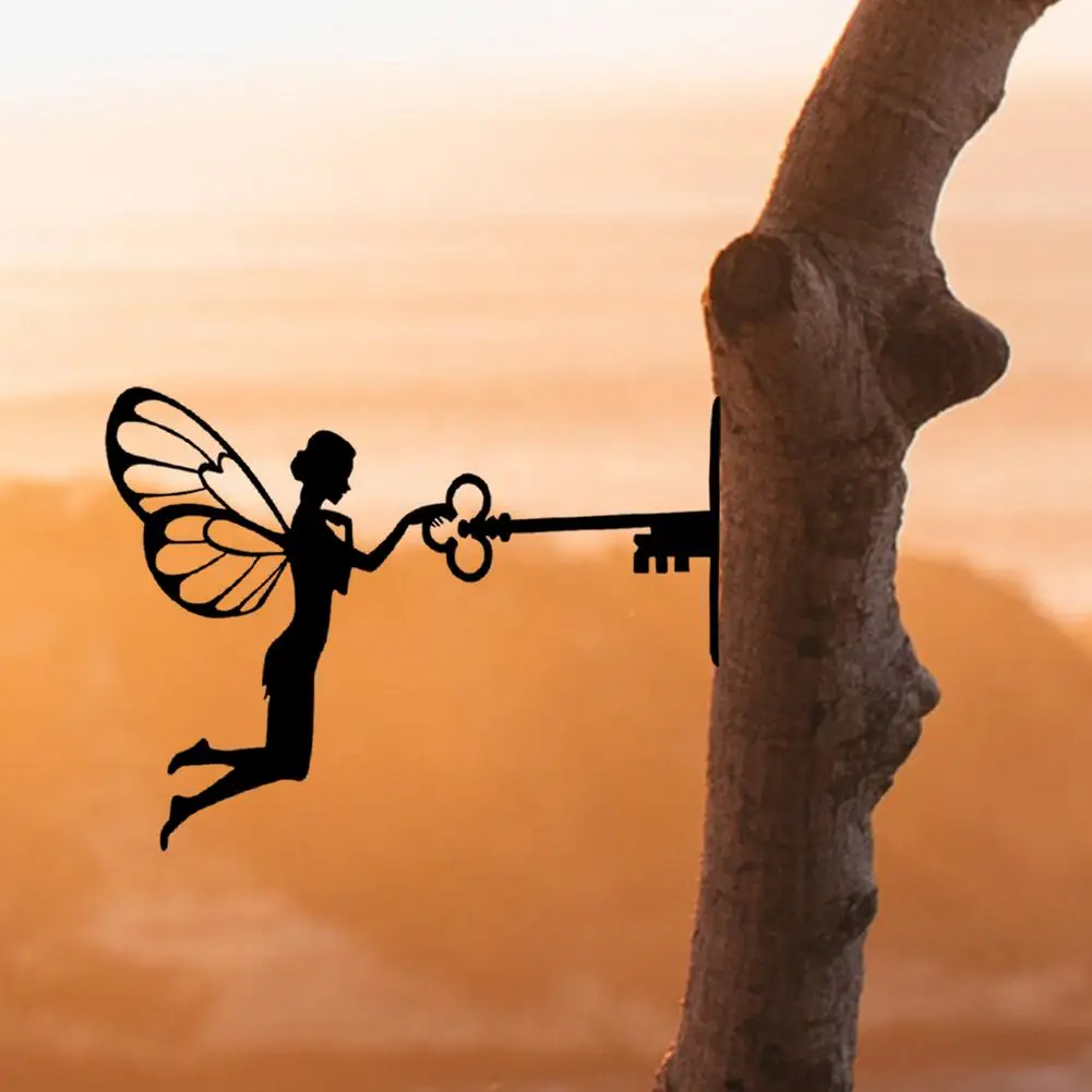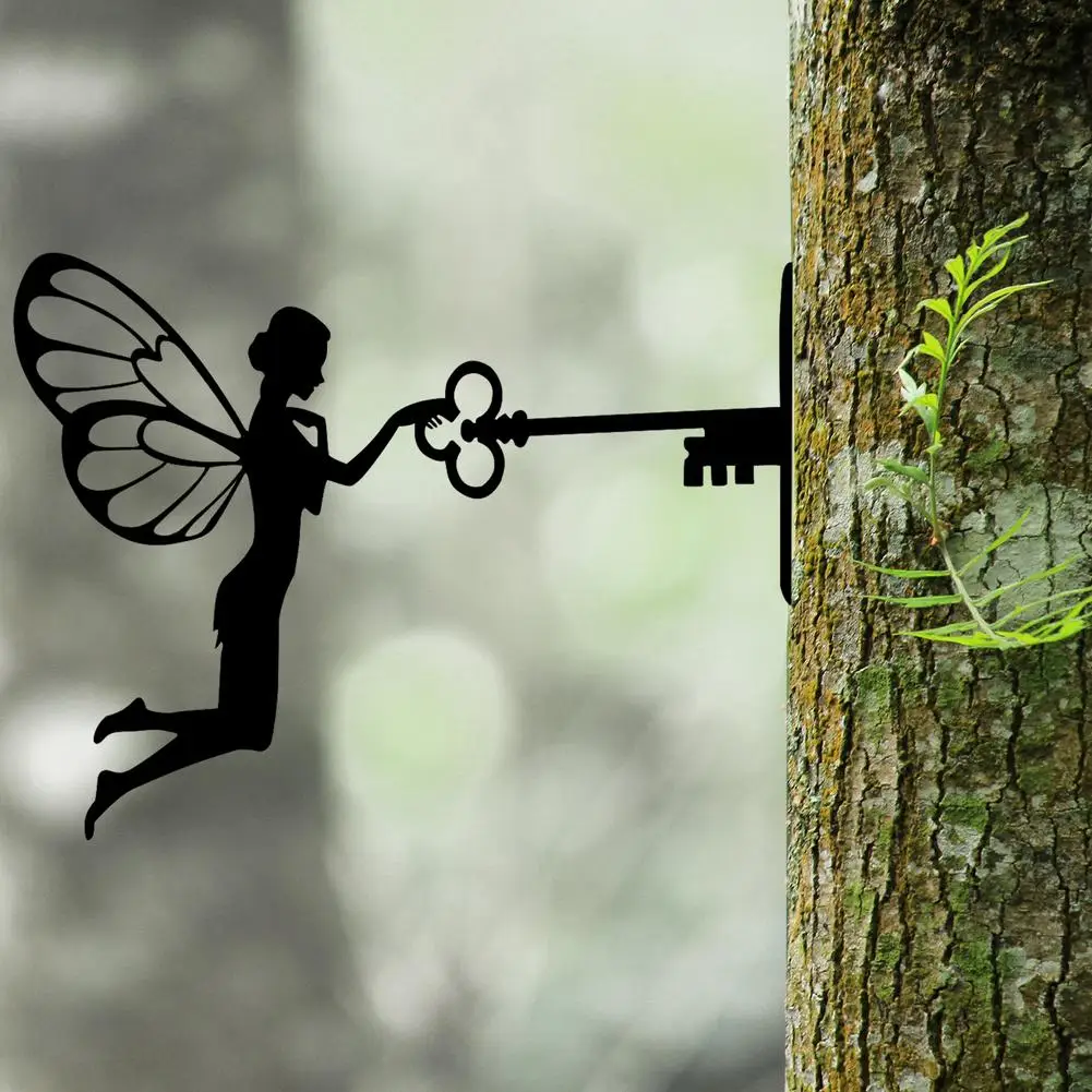2D ogród baśniowa dekoracja, stawka metalowa sztuka Elf sylwetka wstawianie Ornament wróżka otwarte drzwi z kluczem na zewnątrz na drzewo wystrój