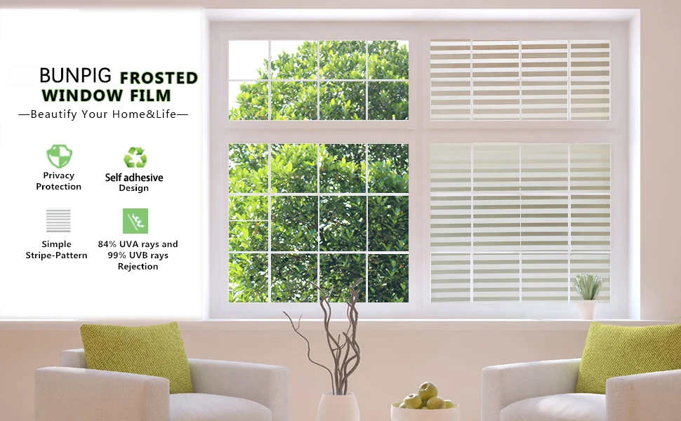 Folia okienna w paski: nowoczesny wzór zapewnia elegancję i piękno w domu i odświeża dom. Doskonała ochrona prywatności: dzięki ochronie wysokiego poziomu prywatności film może blokować ciekawe widoki od ludzi i pomaga stworzyć dla ciebie osobisty i prywatny pokój, bez względu na to, gdzie jesteś-w biurze, sypialni, salonie i tak dalej. Odrzucenie UV i miękki naturalny jasno: ta naklejka okienna może odrzucić 84% promieni UVA i 99% promieni UVB i zapewnia miękkie i naturalne światło słoneczne, szczególnie w upalne lato, kiedy silne światło słoneczne spowodowałoby niewidoczne szkody dla ludzi i mebli. Własna konstrukcja do kleju: z klejami roślinnymi i samoprzylepnymi klejami. to sprawia, że film może być ponownie użyty