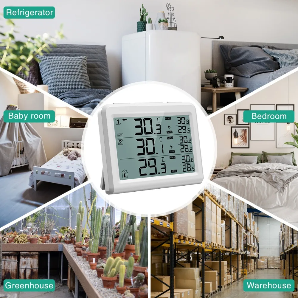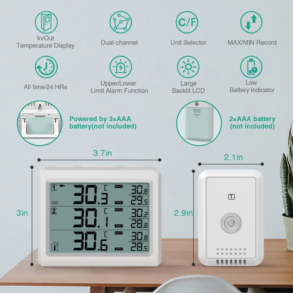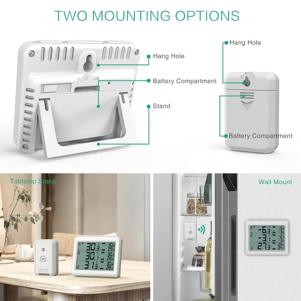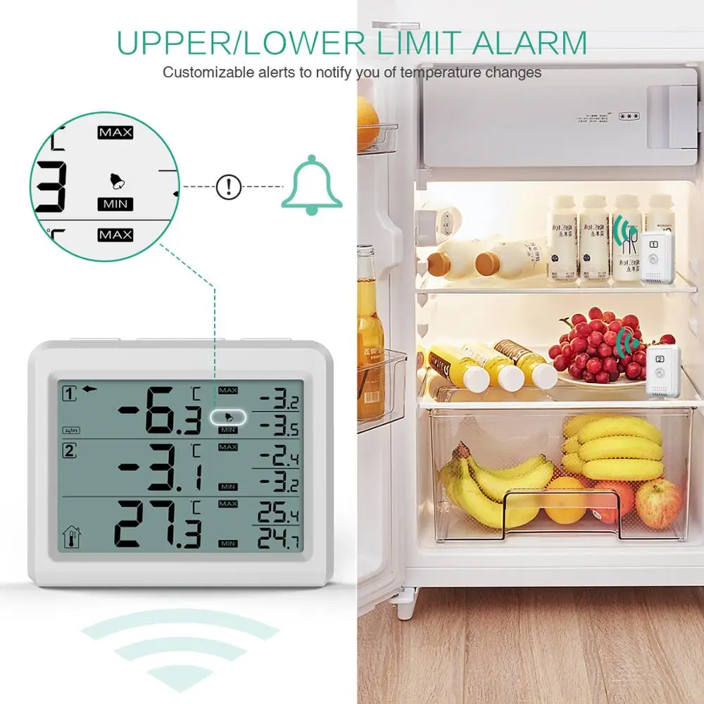【 Alarm dźwiękowy dla Reminding】-bezprzewodowy termometr do lodówki wyposażone w alarm dźwiękowy, gdy temperatura przekracza swoje wstępnie ustawiony minimalna i maksymalna wartość alarmu, termometr zrobi alarm dźwiękowy, aby przypomnieć tobie i twojej rodzinie, aby poznać zmianę temperatury i wprowadzić pewne zmiany w czasie