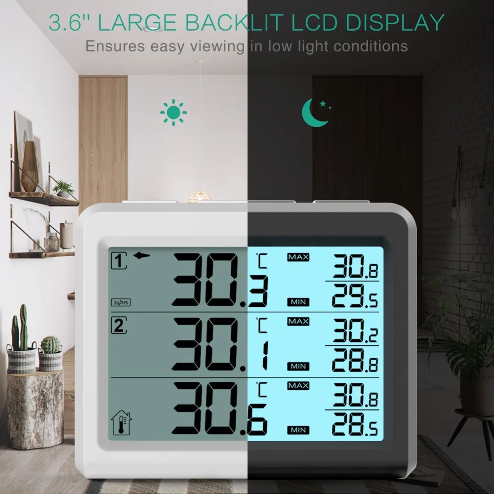 【 3.6-cal czytelny lcd】-ten kryty-termometr zewnętrzny z ekran LCD hd, duży odważne danych i białym podświetleniem, aby zapewnić wygodne oglądanie w dzień lub w nocy. Uwaga: naciśnij podświetlenie wyświetlacza, aby wyłączyć go automatycznie po 10 sekundach. Naciśnij przycisk „℃/℉”, aby przełączyć fahrenheita lub celsjusza
