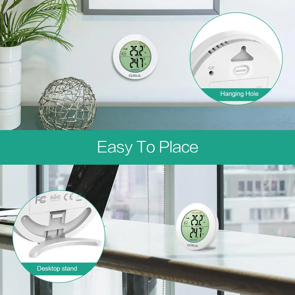 【Elegancki okrągły wzór z 2 opcjami montażowymi 】-higrometr z termometrem cyfrowym ze wspornikiem stołowym i konstrukcją do montażu na ścianie, który idealnie nadaje się do użytku w pomieszczeniach, takich jak biuro, hotel, szklarnie, sala inkubacyjna, sala żywieniowa, szkoła, laboratorium, pokoje dla dzieci, szpitale itp.