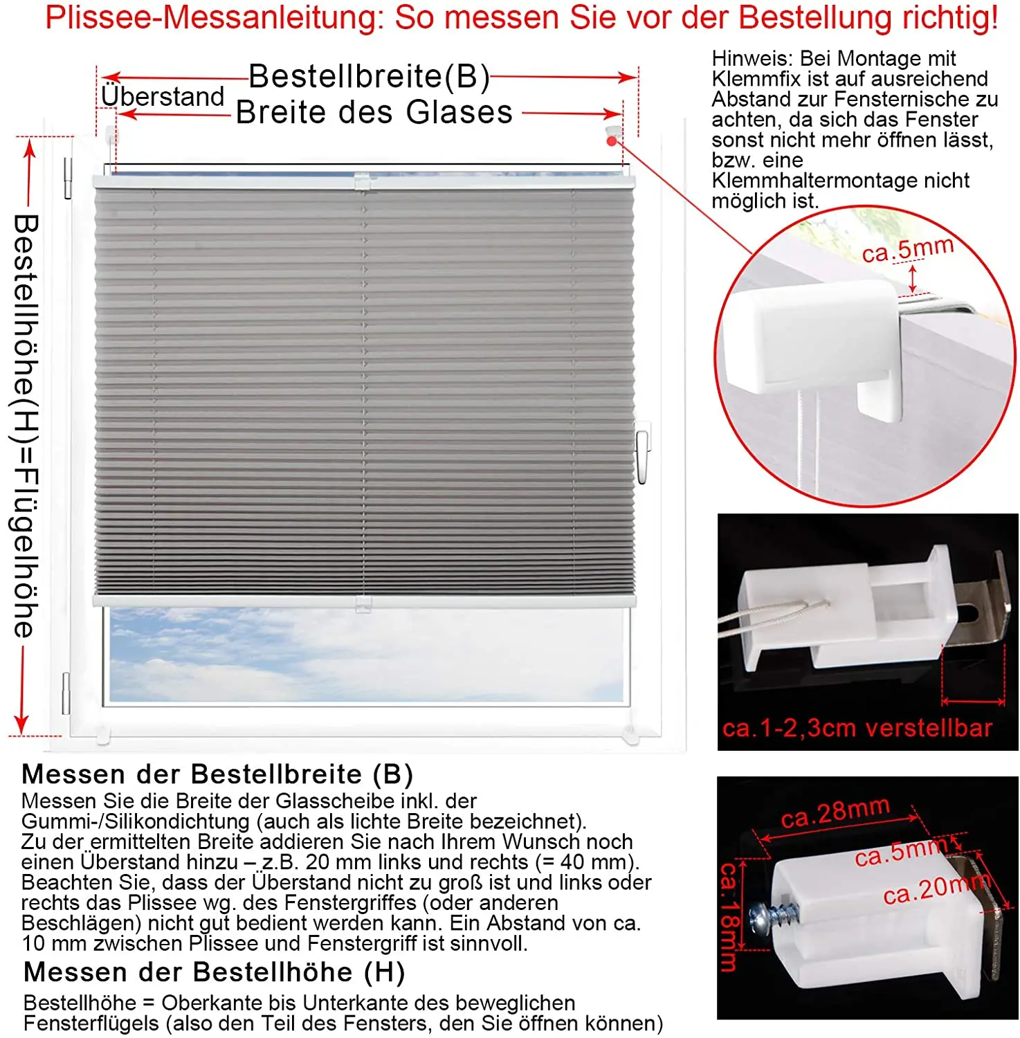Zakres stosowania:❤Okno i drzwi; Nasze rolety plisowane są odpowiednie dla wszystkich drzwi i okien o grubości ramy od 1.5 do 2.3 cm, tj. Maksymalna głębokość rama okienna nie powinna przekraczać 2.3 cm ani być mniejsza niż 1.5 cm (bez uszczelnienia). Zestaw montażowy: 4 metalowy zacisk wsporniki bez wiercenia; Zestaw 4 mocowania klocki do wiercenia okna jako alternatywa.