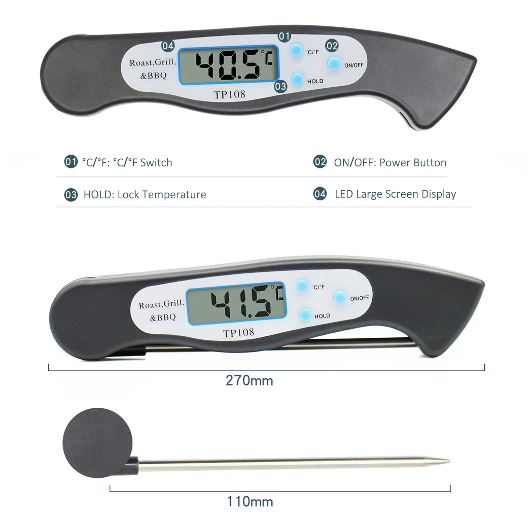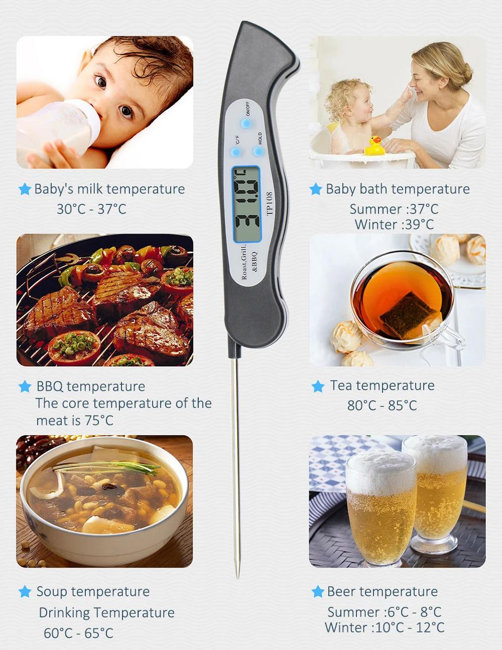 Wyczyść ekran LCD, składany czujnik temperatury ze stali nierdzewnej. Ultraszybki odczyt danych w ciągu 4 do 5 sekund. Duży zakres pomiarowy: -58 ° f do 572 ° f (-50 ° c do 300 ° c) i wymiana między ° c i ° f. Automatyczne zamknięcie off po 10 min bez operacji lub złożyć sondy, aby zamknąć. Może być stosowany do gotowania w kuchni, pieczenia, Mleko lub kąpiel. Magnes z tyłu przykleja się do lodówki lub innych gładkich powierzchni.