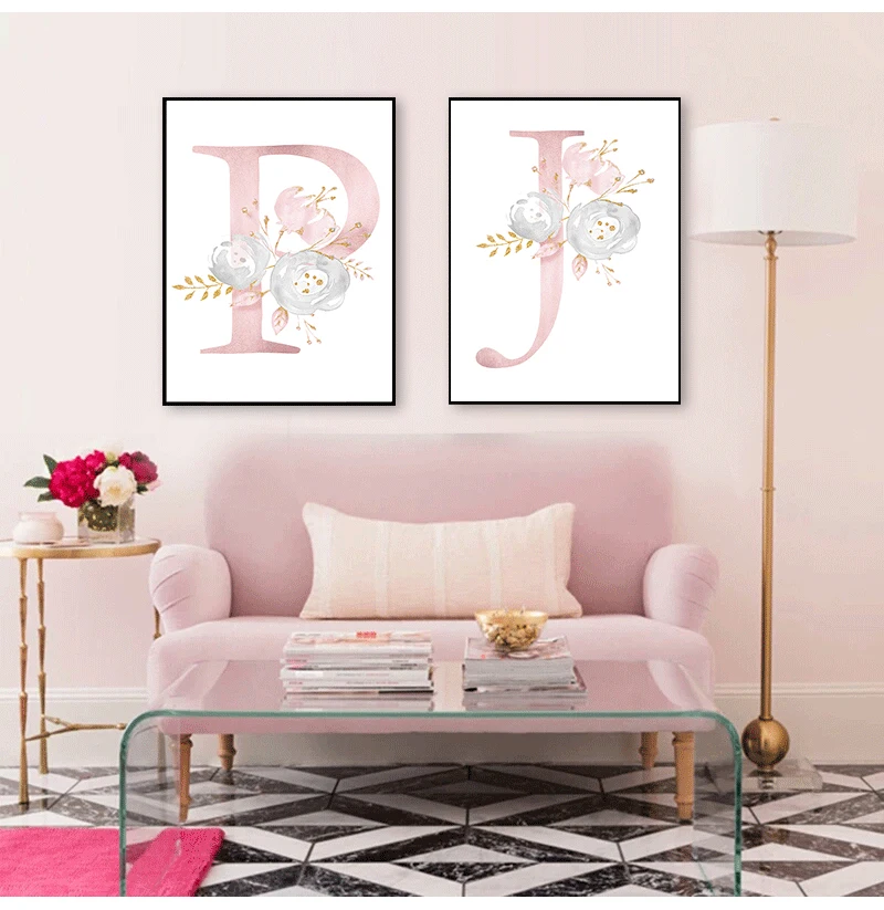 Ściana kwiatów zdjęcia artystyczne dla dekoracja do pokoju dziewczęcego spersonalizowane plakat imię dziecka niestandardowe płótno malowanie grafiki do pokoju dziecięcego różowy