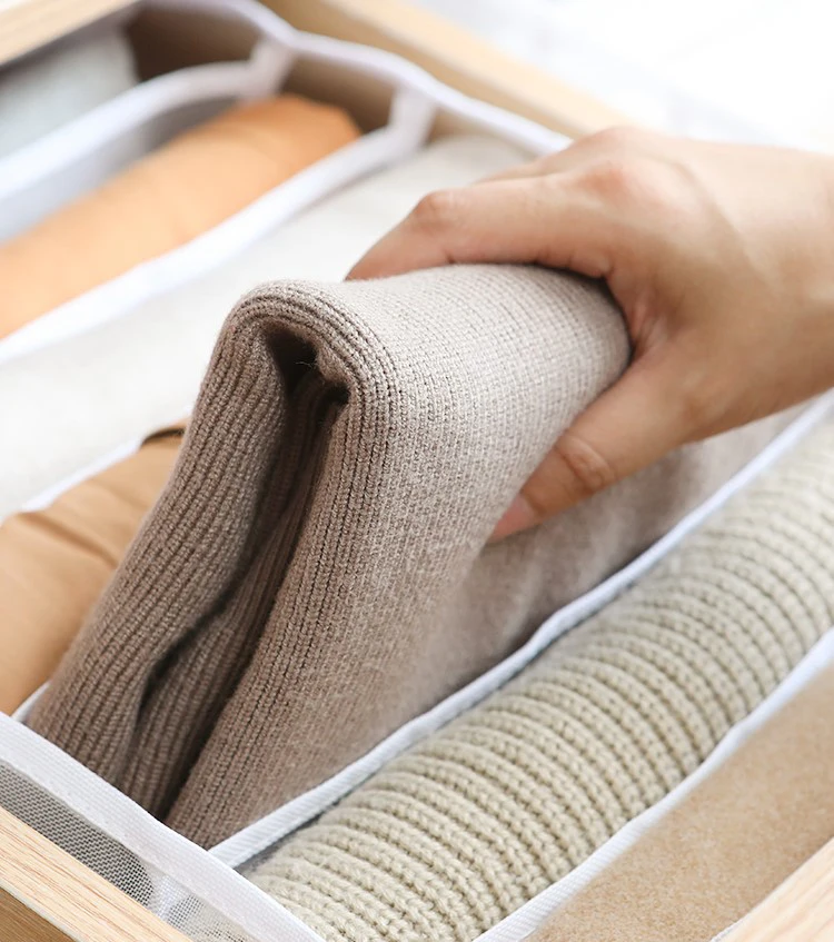 9. 7 siatek z tkaniny (długość 40x szerokość 15x wysokość 11cm: może pomieścić 11 skarpetki dla dorosłych lub 22 skarpetki dziecięce.