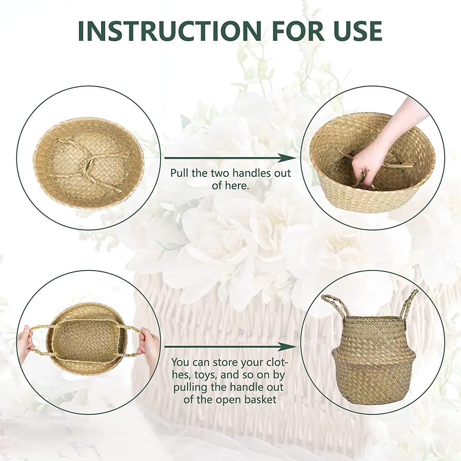 Ten koszyk z trawy morskiej dla roślin z mocnym i ruchomym uchwytem nie jest mocowany za pomocą drutu. Upewnij się, że miejsce jest płaskie, aby idealnie się wyróżniało, w przeciwnym razie jeśli miejsce zostanie ściśnięte, może zostać odkształcone. Uwaga: rośliny nie mogą być uprawiane bezpośrednio w koszyku, musisz sadzić w doniczkach. Kosz będzie nadal kształtował się przy ciągłym użytkowaniu.