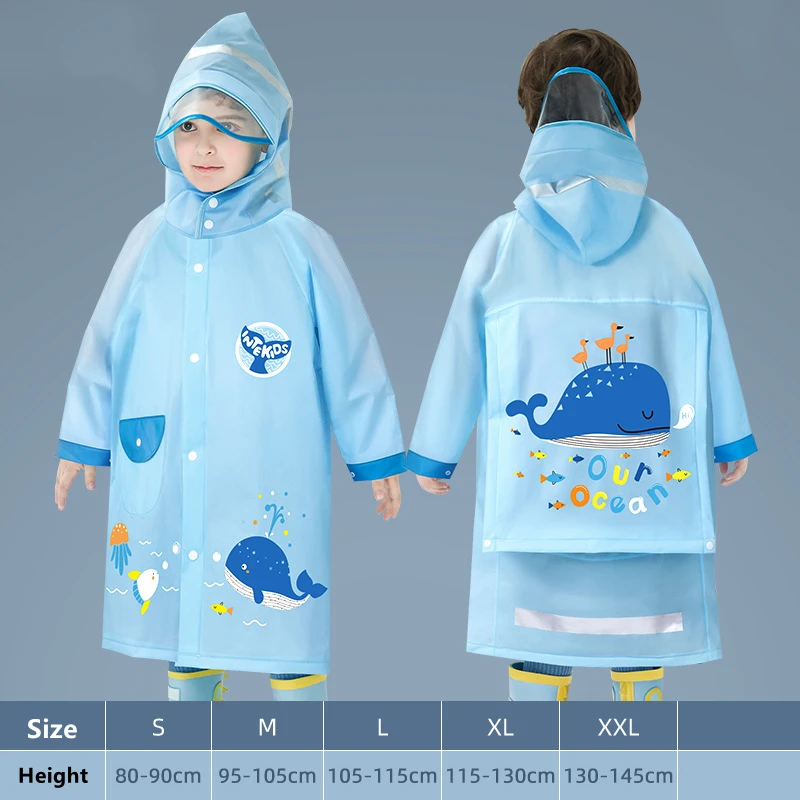 Rozmiar L płaszcz przeciwdeszczowy długość 65 cm, rękaw 49 cm, klatka piersiowa 100 cm, odpowiedni dla dzieci o wzroście 105-115 cm