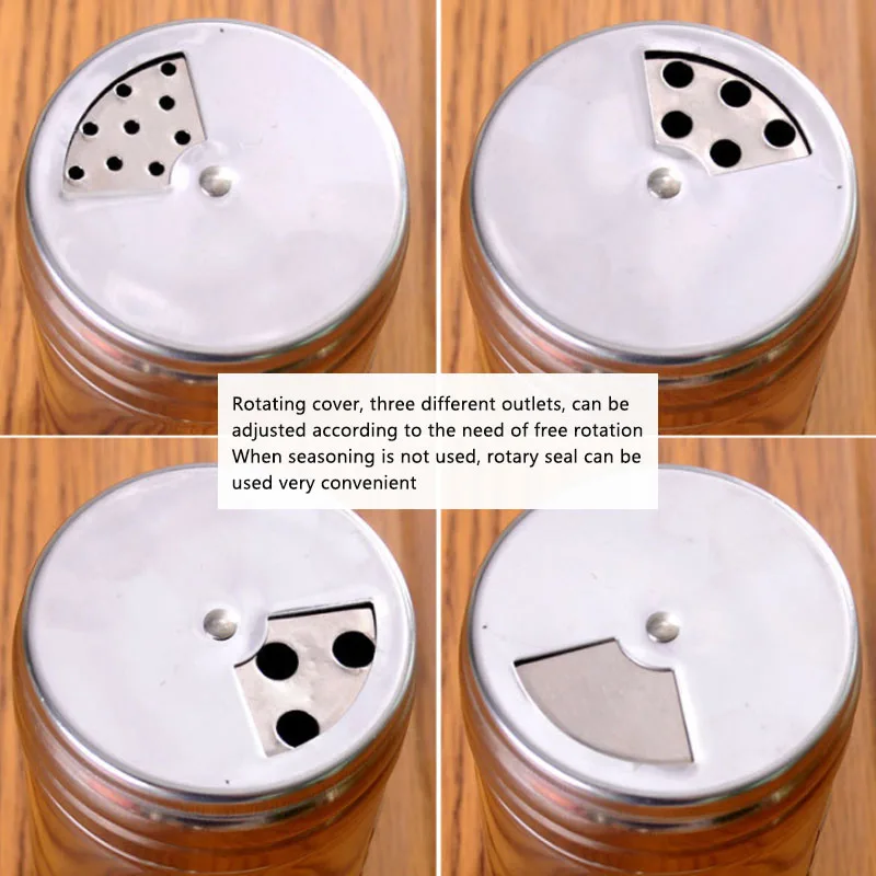 Unikalna konstrukcja obrotowej struktury wielootworowej: obróć, aby wybrać trzy rozmiary selektora na górze wytrząsarki, aby dozować różne grindy przypraw, może być stosowany do wszystkich przypraw w proszku