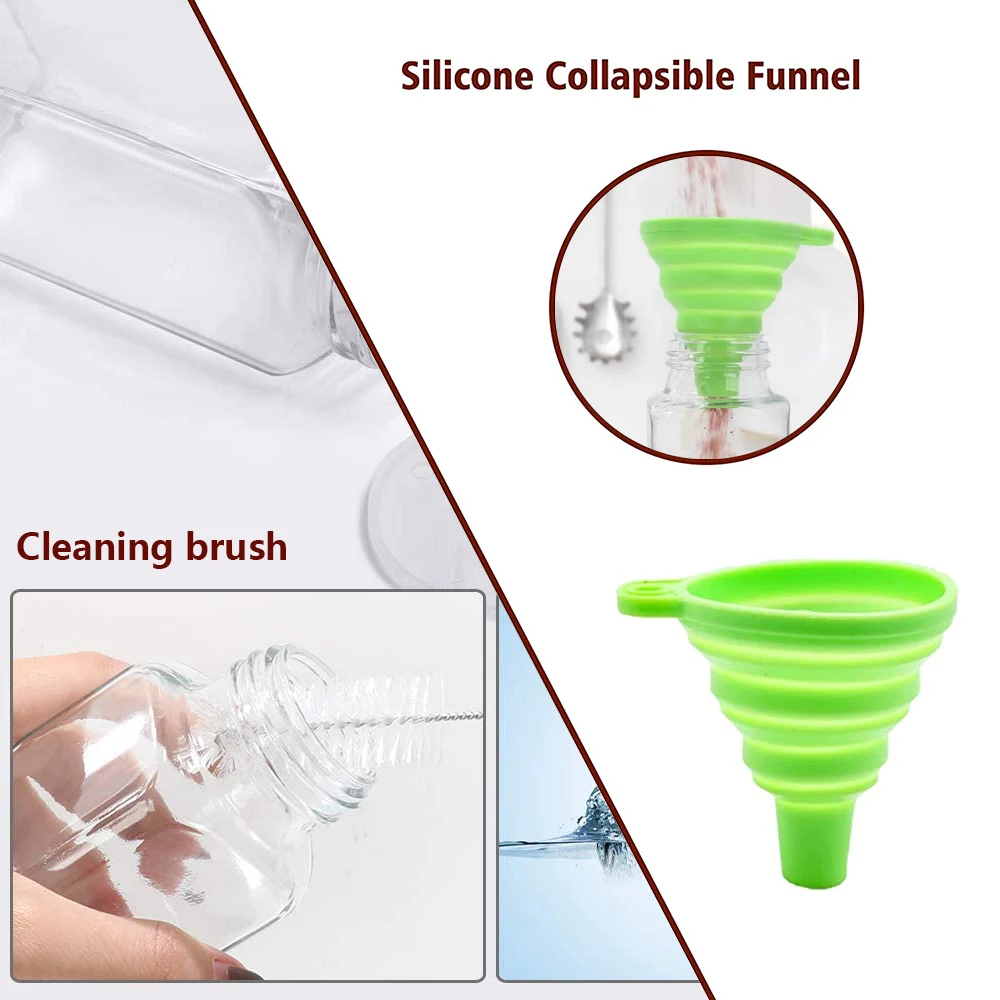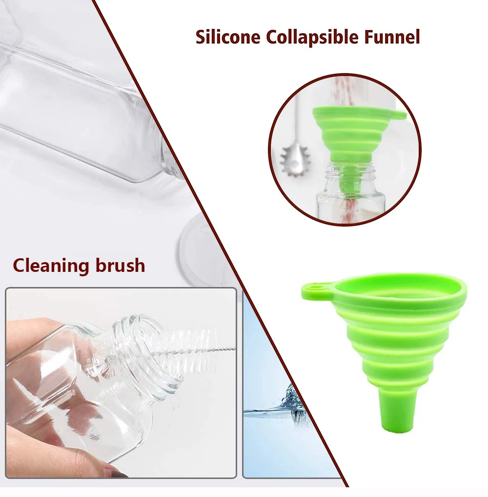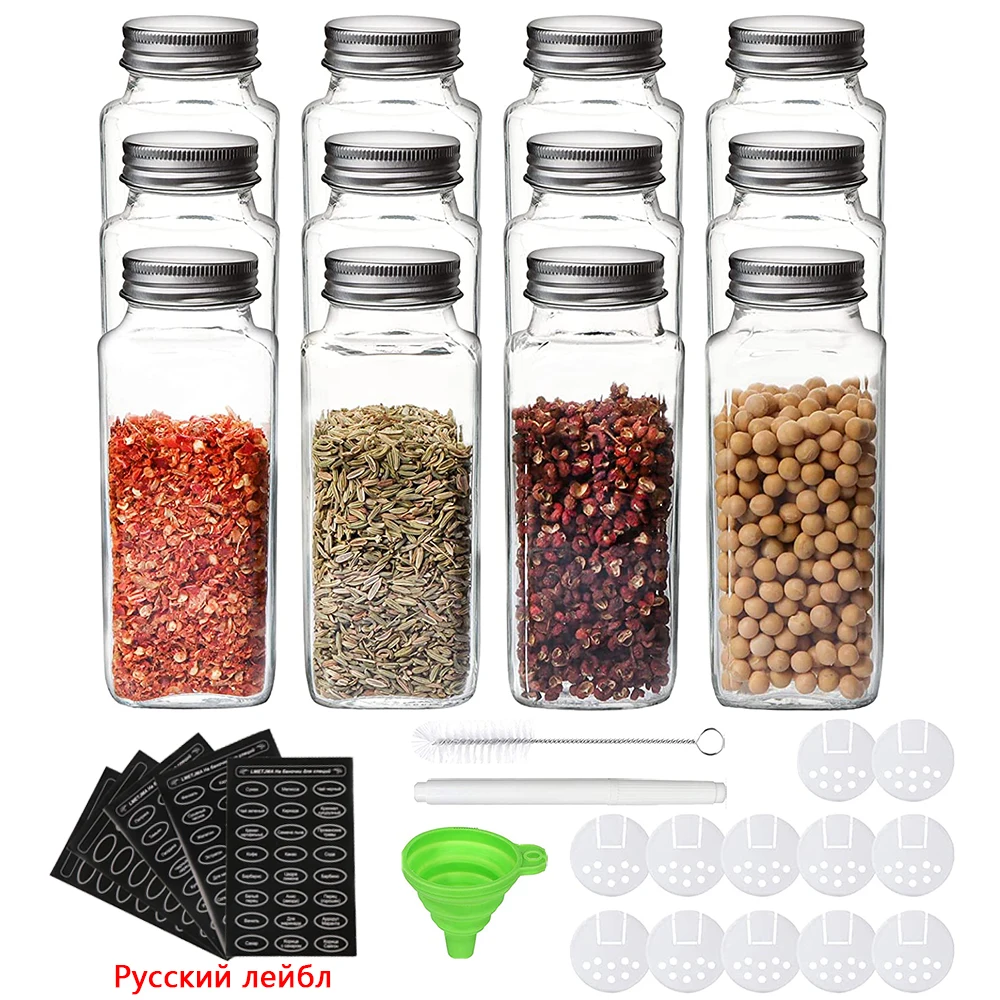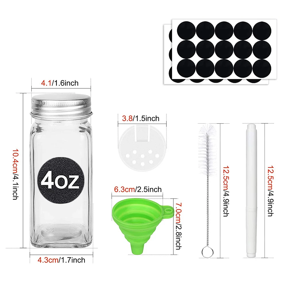 Opakowanie zawiera: 12 szt. Szklane słoiki na przyprawy z plastikowym sift & pour shaker caps i srebrne metalowe zakrętki, w zestawie 30 szt. Czarnej etykiety z tablicy kredowej na znak, 1 szczotka do czyszczenia do łatwego czyszczenia i 1 silikonowy składany lejek do łatwego napełniania.