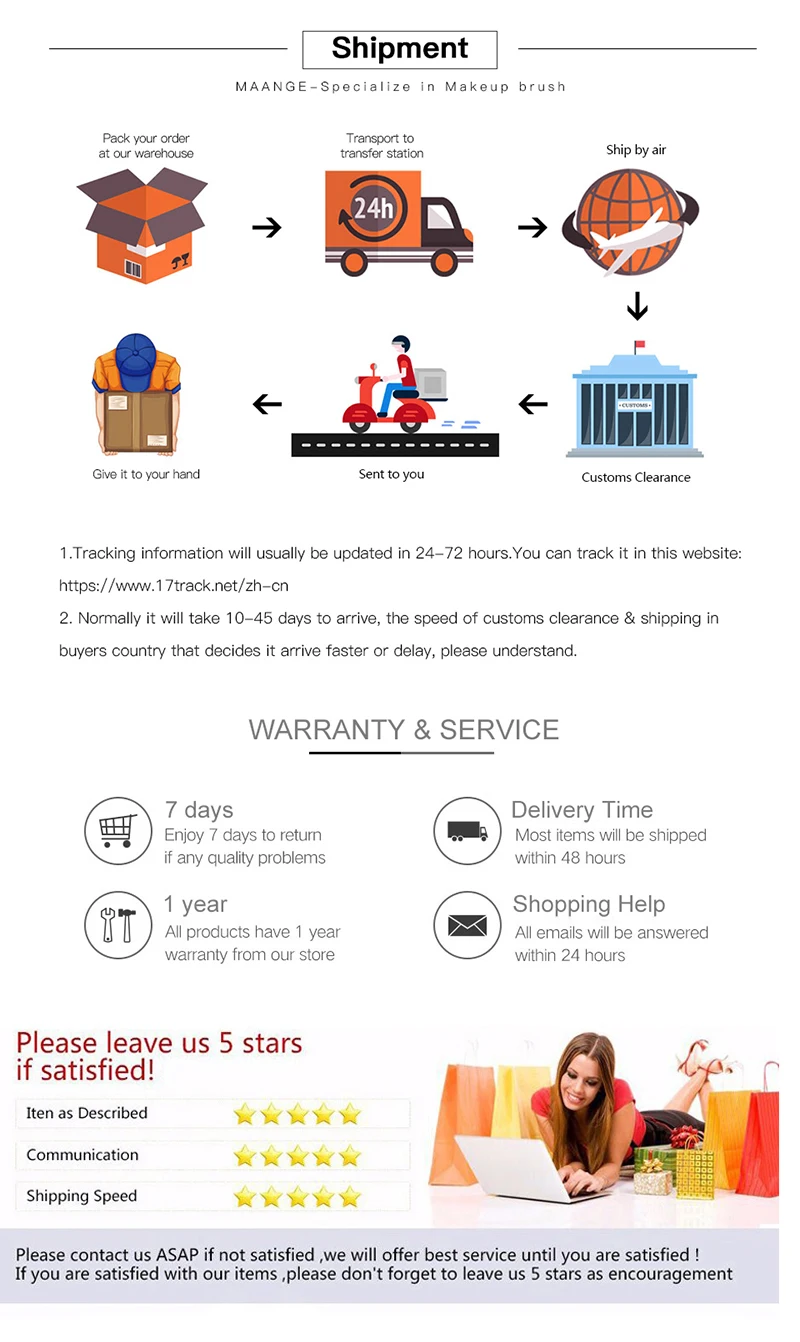 4. Informacje o śledzeniu zostaną dostarczone w ciągu 2-5 dni po wysyłce (niektóre bezpłatne logistyki nie mają informacji o śledzeniu). Jeśli nadal nie otrzymasz towaru, gdy termin dostawy dobiega końca, skontaktuj się z nami, aby przedłużyć termin dostawy.