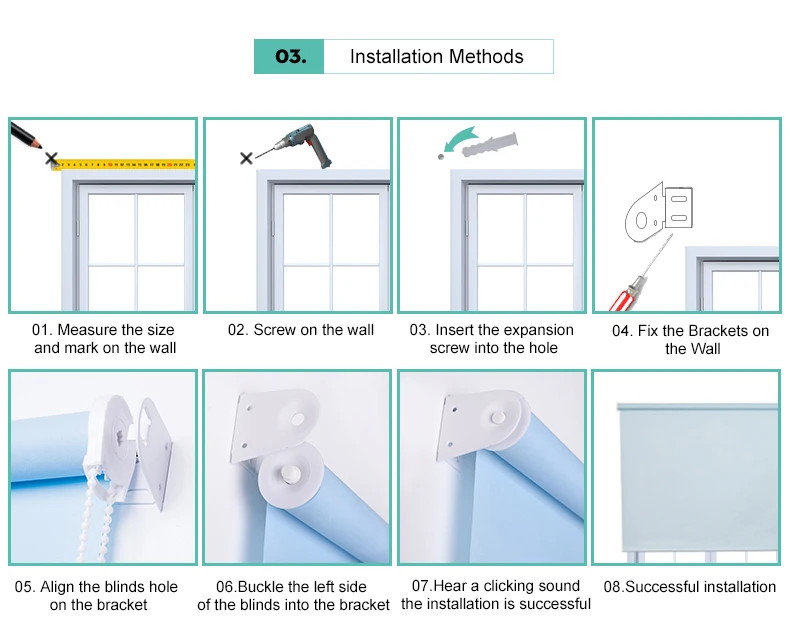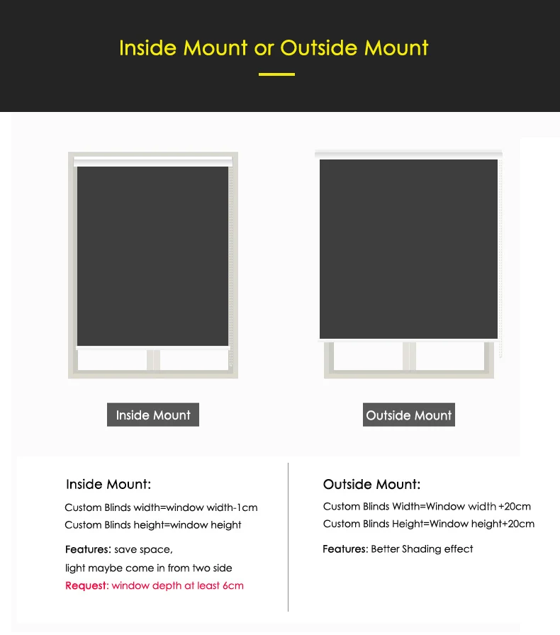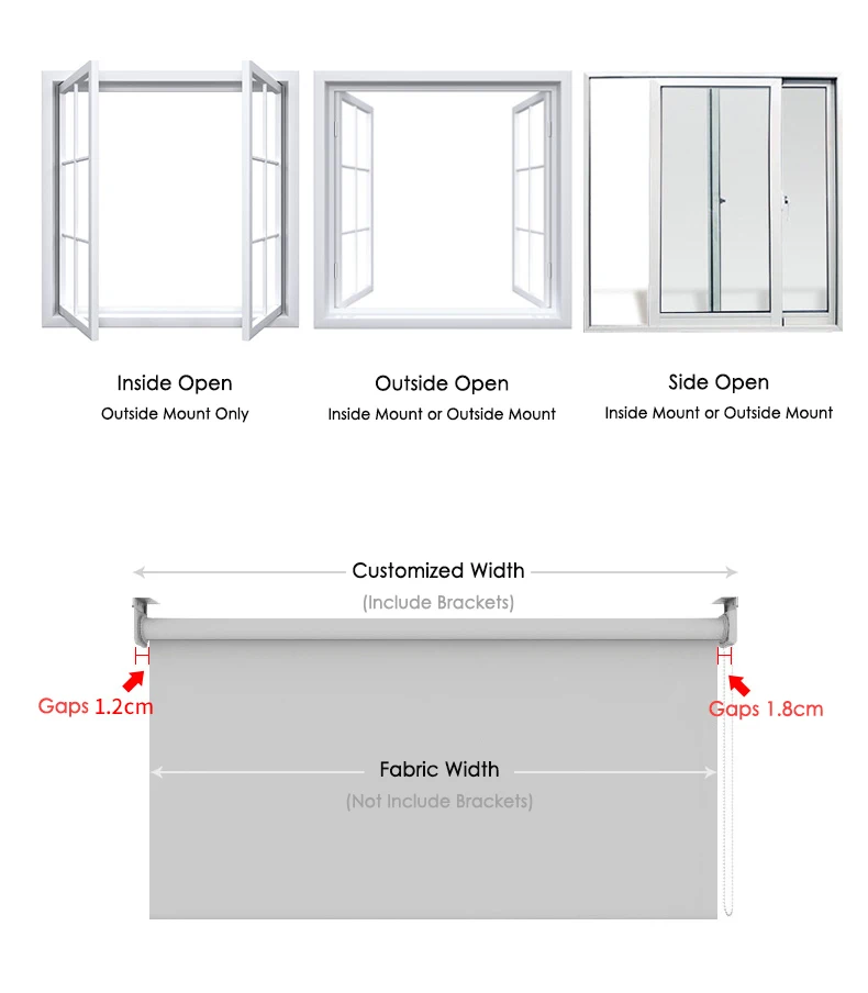 2. Dostosowana szerokość żaluzji = szerokość tkaniny + szerokość wsporników (3 ~ 4cm) .