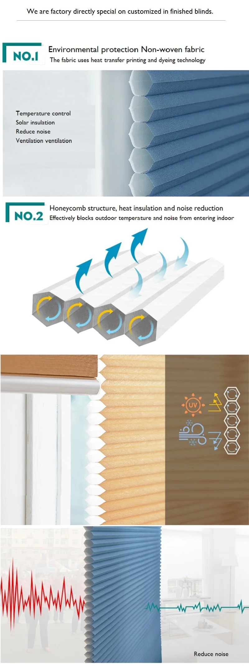 Odcienie komórkowe o strukturze plastra miodu są dostępne w tkaninach pojedynczych i podwójnych komórek, standardowe rozmiary plis 25mm (1 cal) z filtrem światła i tkaninami zaciemniającymi.