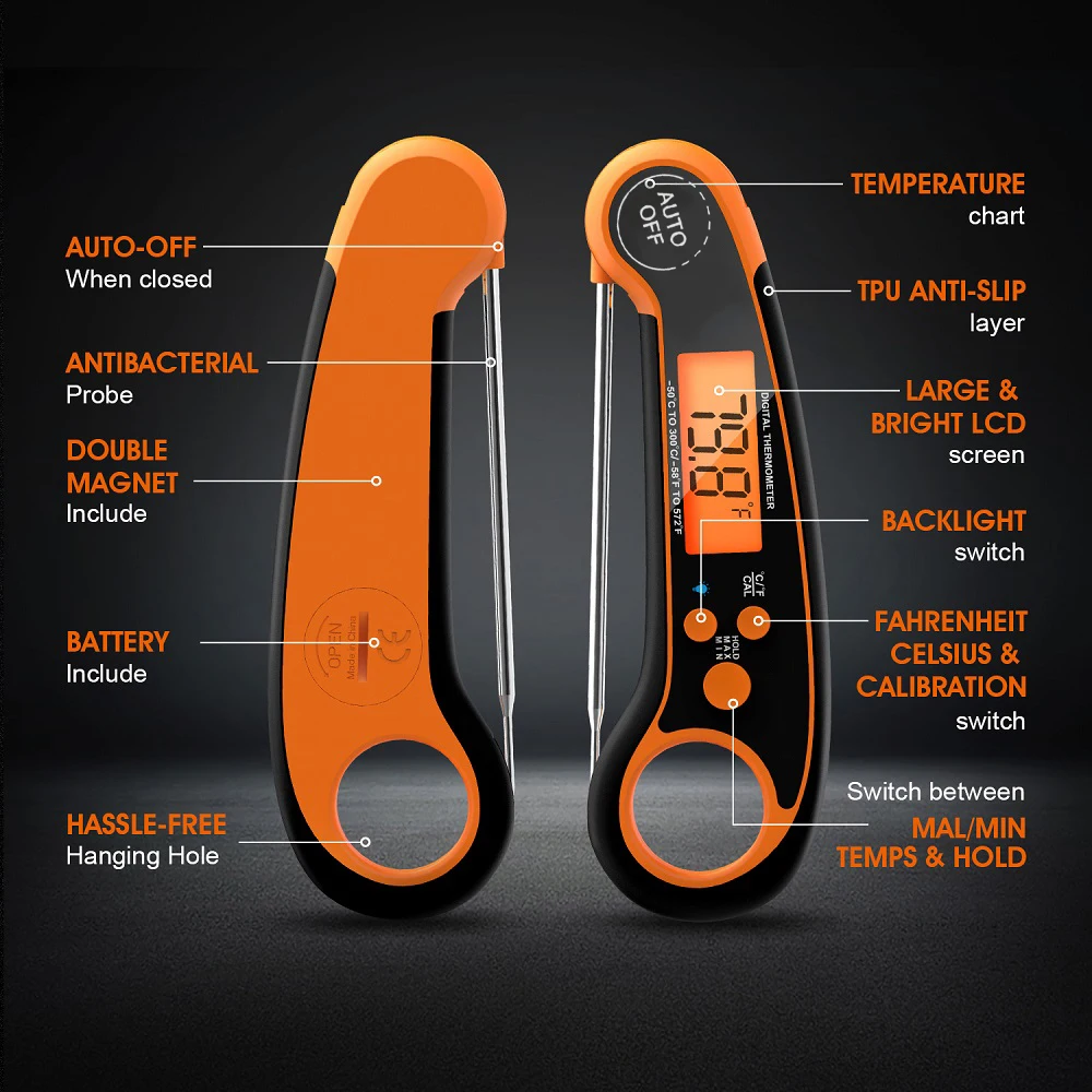 Natychmiastowa i precyzyjna temperatura odczytana w ciągu 2-3 sekund wysoka dokładność ± 1 ° c zakres pomiarowy: -58 ℉ do 572 ℉/-50 ℃ do 300 ℃ rozdzielczość: wytrzymały plastikowy korpus ABS IP67 wodoodporny materiał sondy certyfikacyjnej: bezpieczeństwo żywności 0.1 odczyty celsjusza i fahrenheita ze stali nierdzewnej duży jasny podświetlany wyświetlacz LCD, 0.2 ℃/304 ℉ Min/Max odczyt temperatury oszczędzaj możliwości Łatwe do odczytania automatyczne zamknięcie off – standby okres 10 minut automatyczne zamknięcie off przycisk podczas zamykania sondy wygodny uchwyt grip dla lepszej obsługi ciężkich, długo trwała bateria życie poręczny otwór pętli do łatwego przechowywania przewodnik temperatury mięsa laminowane na ciele