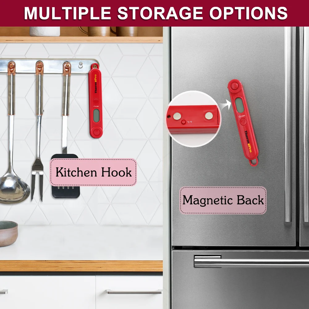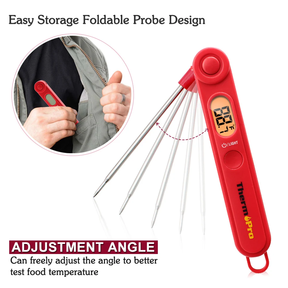 ThermoPro TP-03B jest skutecznym rozwiązaniem do osiągnięcia najdokładniejszej temperatury w ciągu kilku sekund. Cyfrowa kuchenna termometr z uproszczonym, ale praktyczny design, że naciśnięciem przycisku, The foldaway sonda będzie pop otwarte dla szybkiego i łatwy odczyt temperatury, A kiedy skończysz, biorąc pomiar temperatury, możesz złożyć sondę z powrotem, aby upewnić się, że sonda jest bezpieczna i czysta.