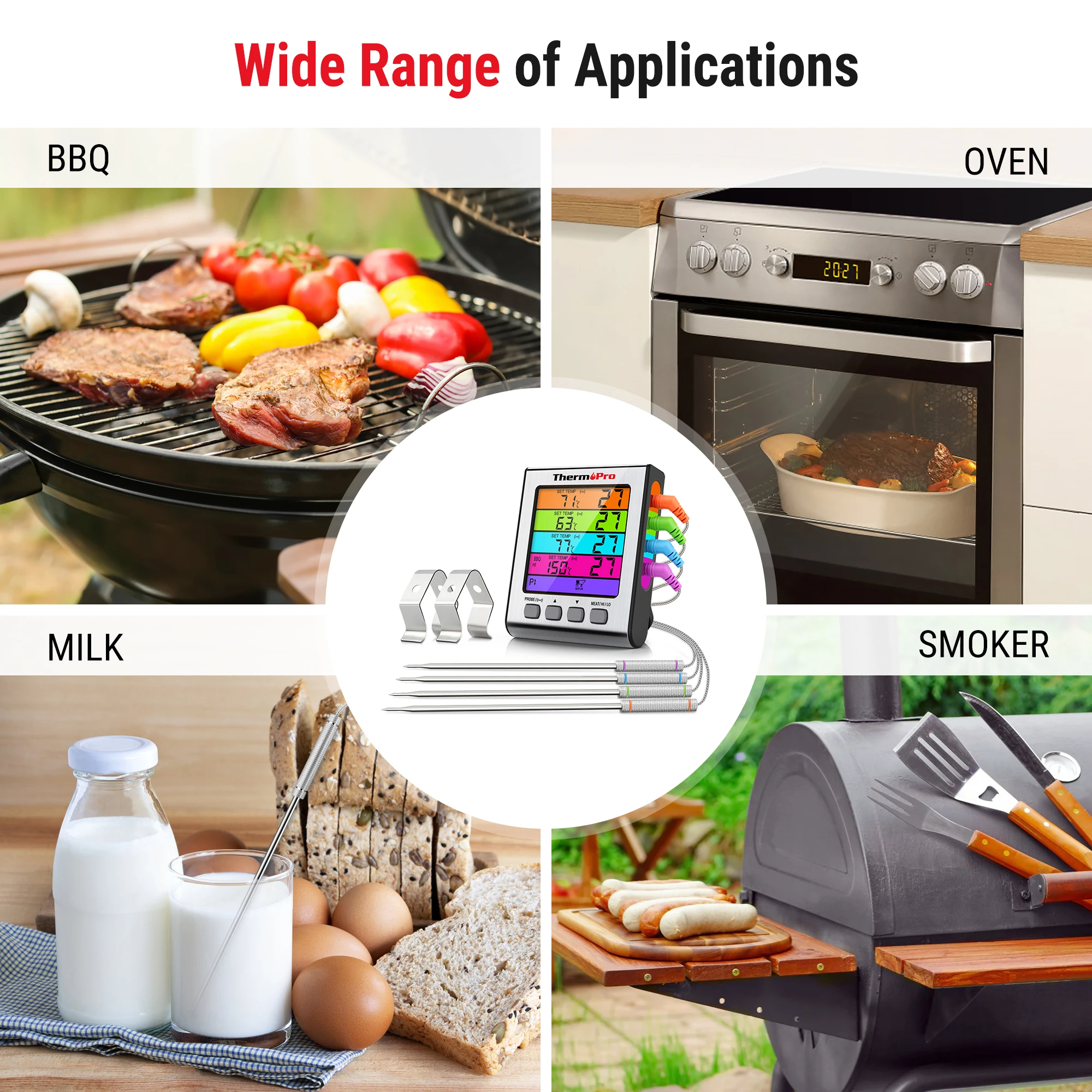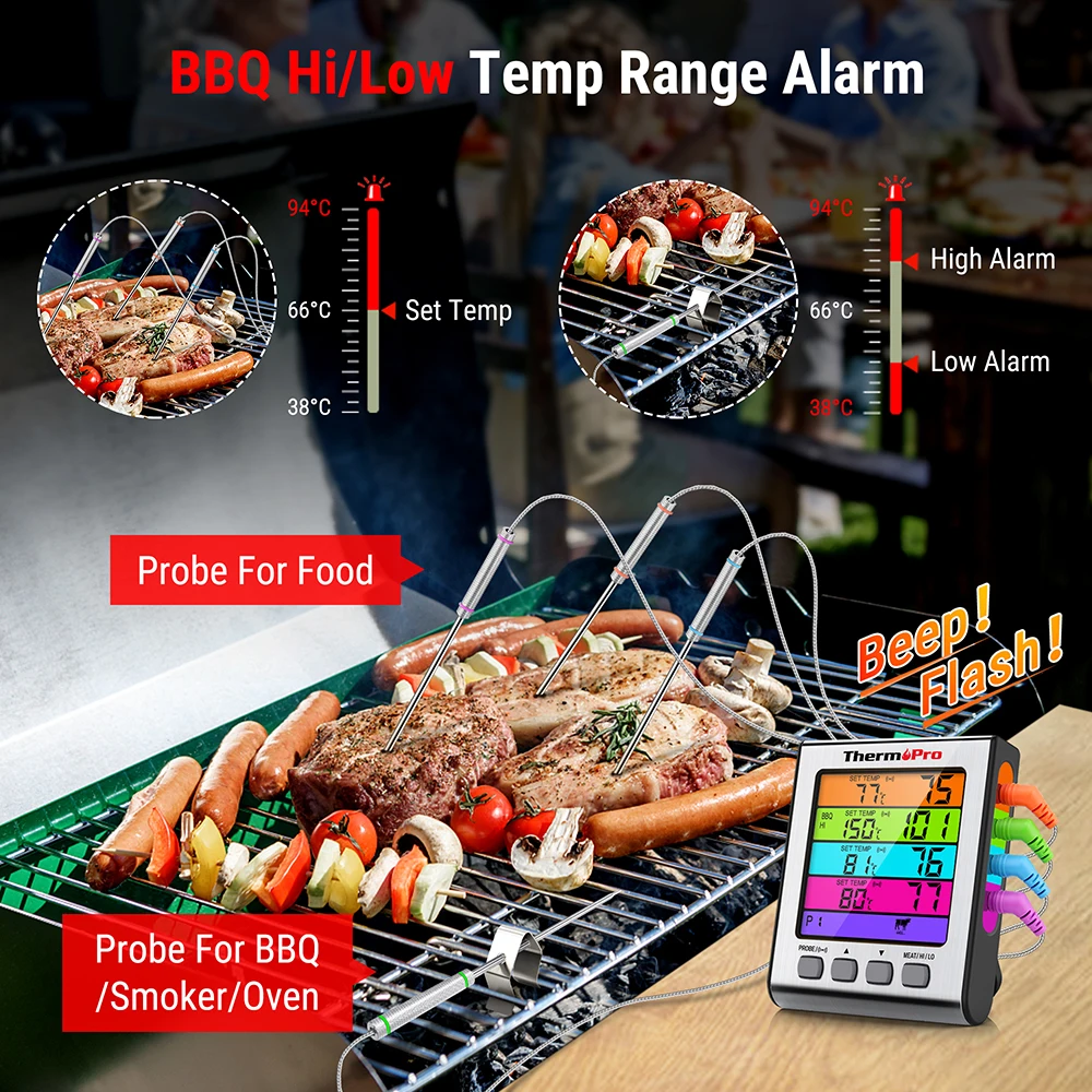 TP17H zaprojektowany z 4 sondami wyświetla 4 temperatury w tym samym czasie. I powlekane 4 różne kolorowe sondy i różne podświetlenie mogą wyeliminować zamieszanie podczas monitorowania wielu różnych rodzajów mięsa.