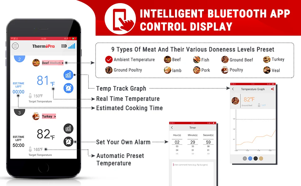 I przez 2.4GHZ bezprzewodowa funkcja Bluetooth, połączenie z aplikacją mobilną przez moduł Bluetooth, będziesz teraz mógł zdalnie monitorować temperaturę jedzenia i ile czasu pozostało na zrobienie jedzenia ze smartfona.