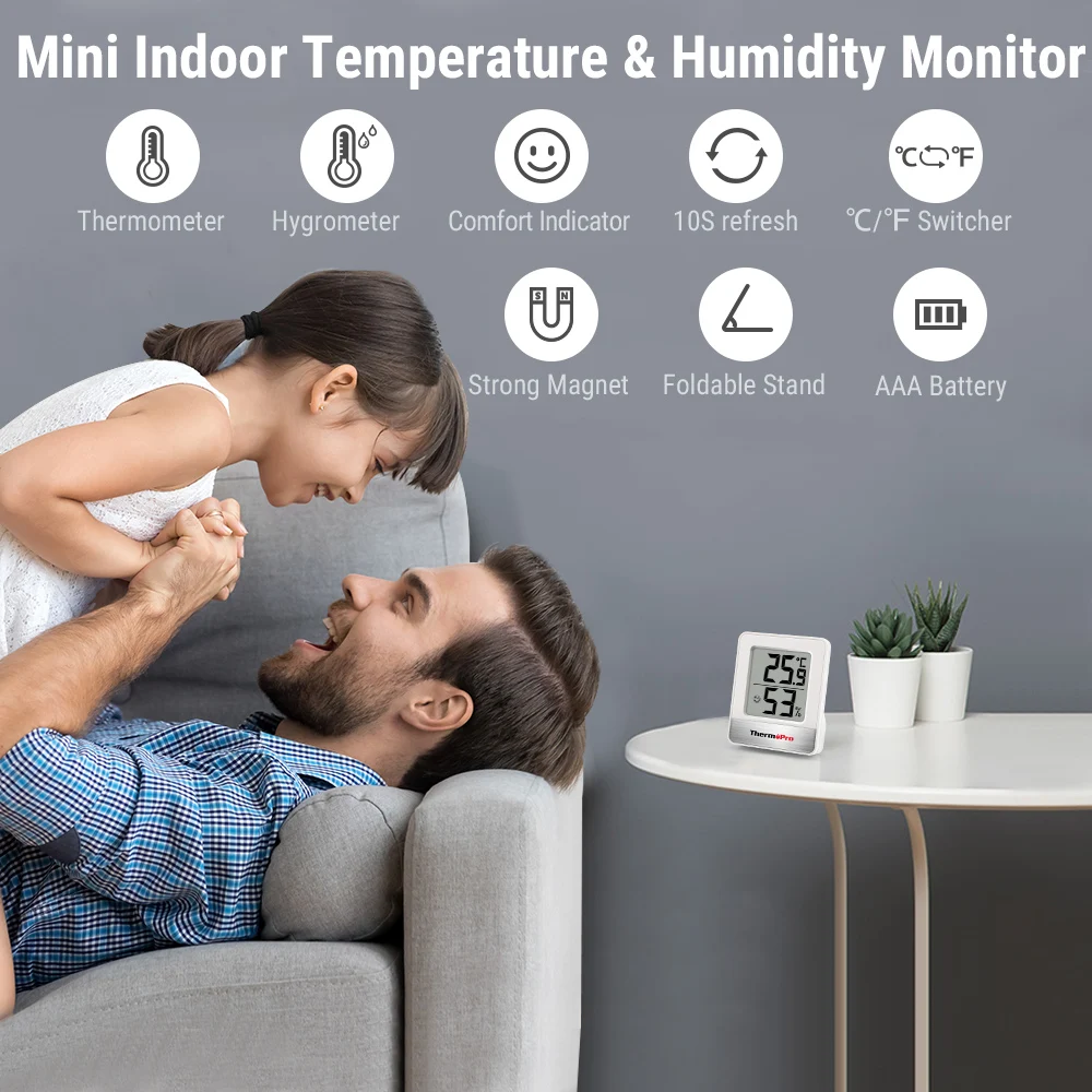 TP49 to mini termometr pokojowy, a monitor wilgotności z wyjątkowo czułym czujnikiem wilgotności szybko poinformuje cię o poziom komfortu (suchy, wygodny, mokry) w pomieszczeniu w oparciu o wilgotność.