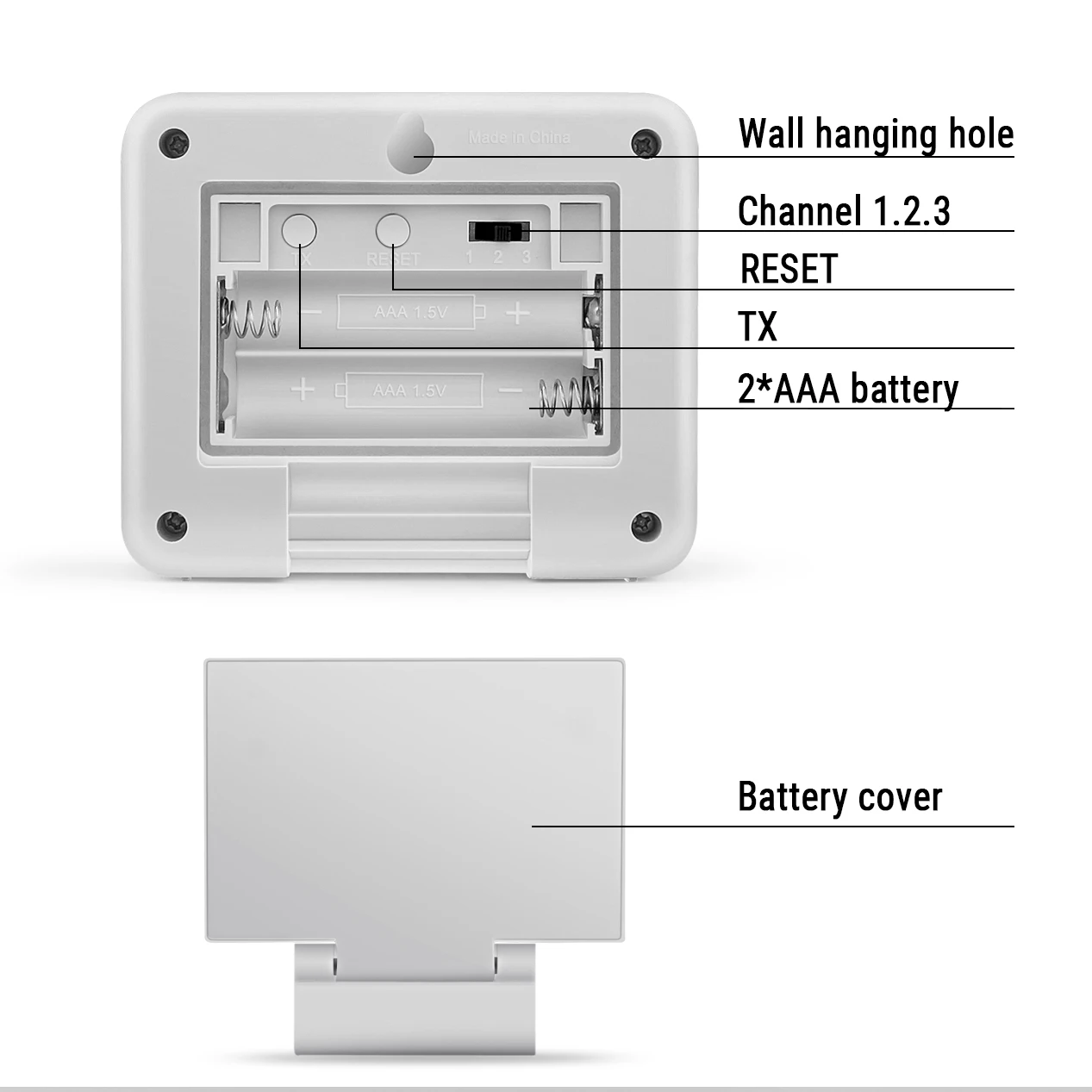Temperatura i monitor wilgotności stoi w pozycji pionowej do użytku na blacie lub jest montowany na ścianie. Czujnik zdalny jest również montowany na ścianie.
