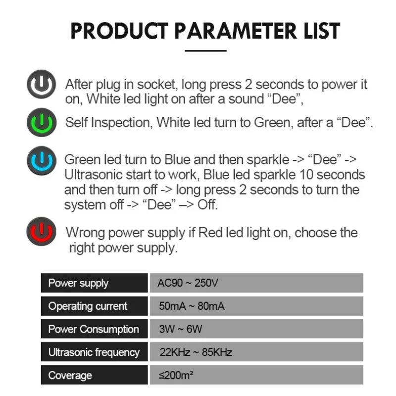 Łatwy w użyciu: wystarczy podłączyć urządzenie do gniazda i przytrzymać przycisk zasilania przez 2 sekundy. Inteligentny układ kontrolny zapewni inteligentna opaska kontroli częstotliwości między 22KHZ – 85KHZ. Upewnij się, aby zainstalować go pionowo 20-80 cm od podłogi. I upewnij się, że nie ma żadnych barier, takich jak zasłony lub szafki zakrywające przed odstraszaczem.