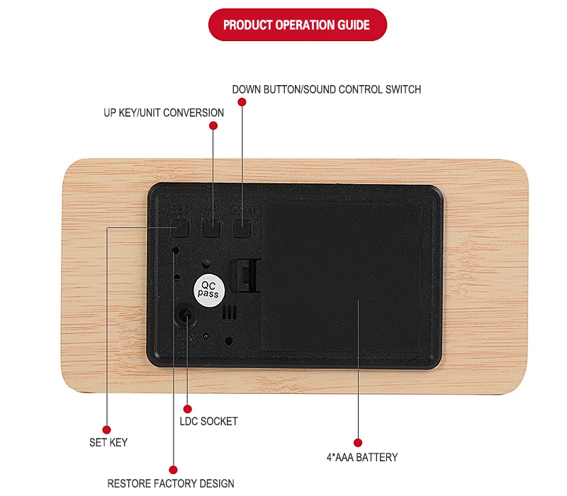 Naciśnij i przytrzymaj przycisk „SET” przez trzy sekundy, aby przejść do ustawienia. Sekwencja ustawień to: year-month-day-12H/24h-hour-minut-second-alarm. Naciśnij „DOWN” lub „UP”, aby wyregulować w górę lub w dół. Po ustawieniu elementu naciśnij przycisk „SET”, aby wprowadzić ustawienie następnego elementu.