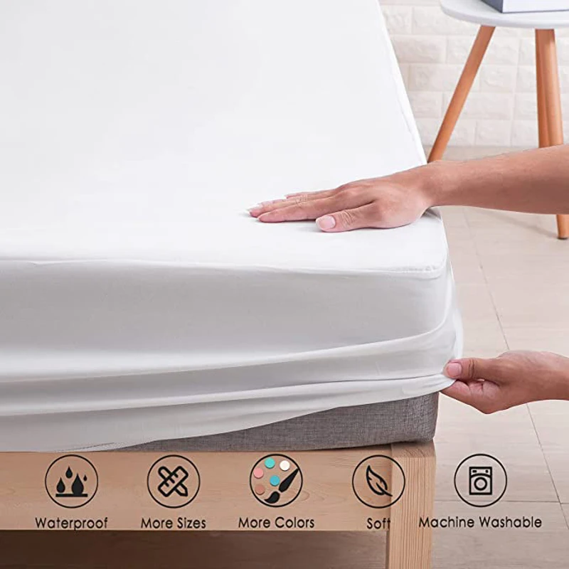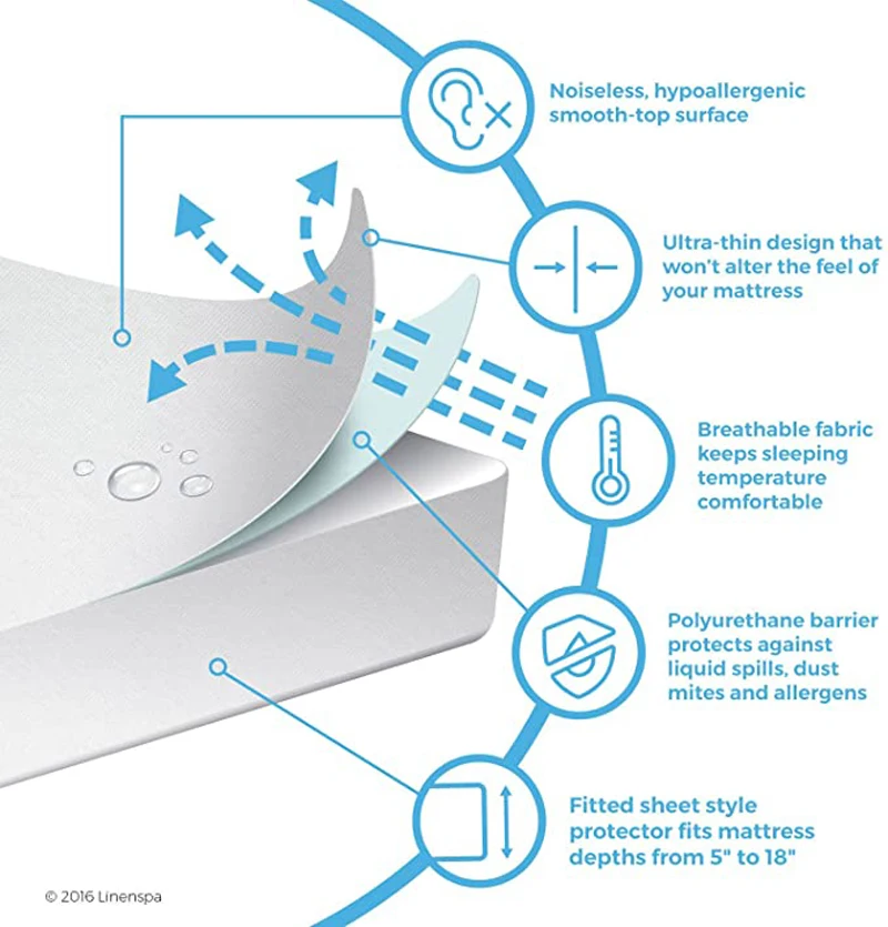 Materac wodoodporny ochraniacz wykonany jest z najwyższej jakości membrany TPU, rozciągliwego materiału premium, który jest znacznie bardziej miękki niż winyl; Skutecznie blokuje wszelkiego rodzaju płyny, wycieki i plamy przed rujnowaniem drogiego materaca, I nie czujesz żadnych plastycznych dźwięków podczas snu na nim.