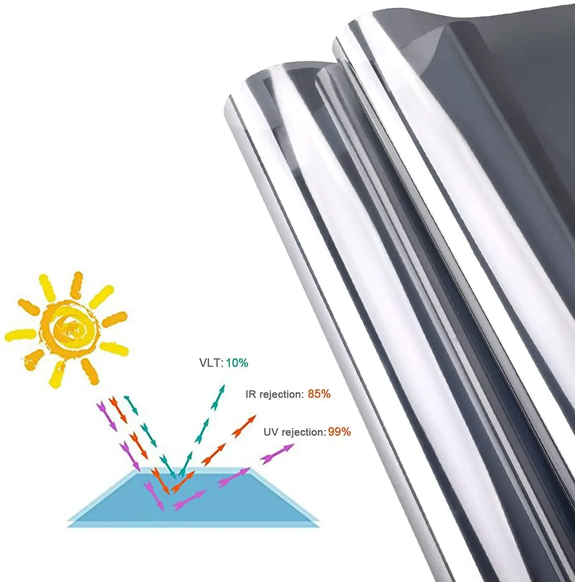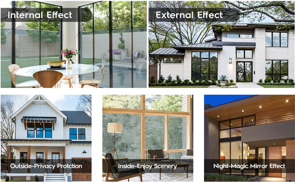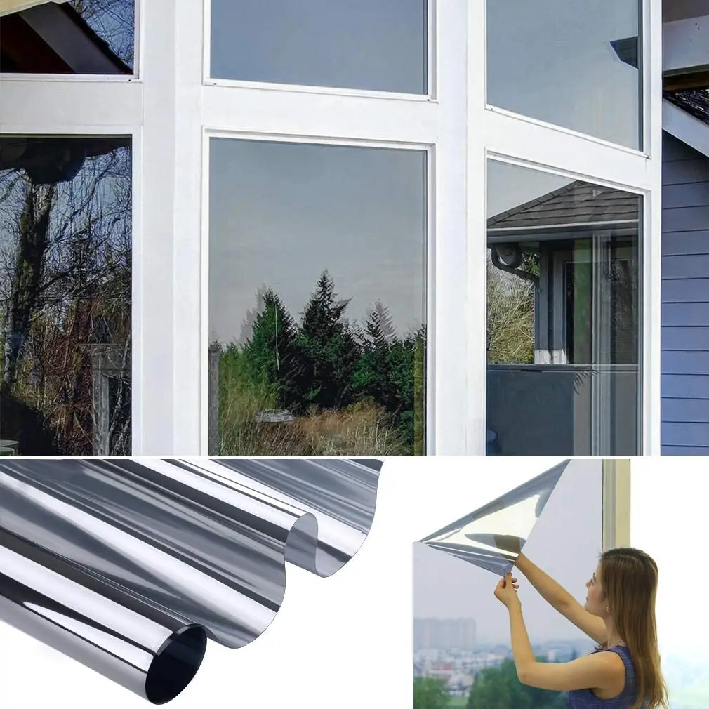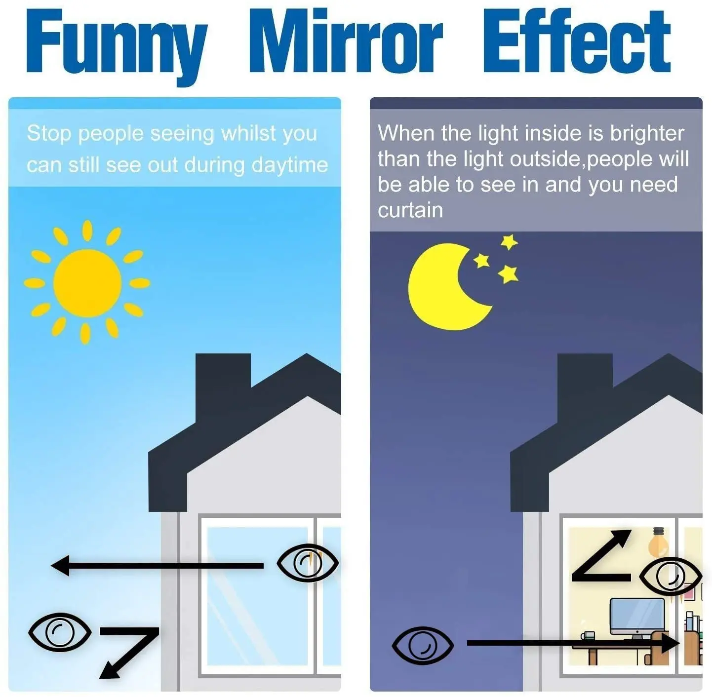 Ta odblaskowa folia okienna zapewnia efekt prywatności w ciągu dnia, gdy światło zewnętrzne jest jaśniejsze niż wewnątrz, które będzie prezentować odbicie lustrzane na zewnątrz; Jeśli ciemniejszy niż wewnątrz, efekt zniknie, proponuję narysować zasłony w nocy.