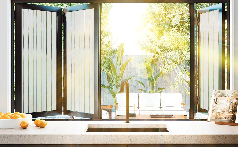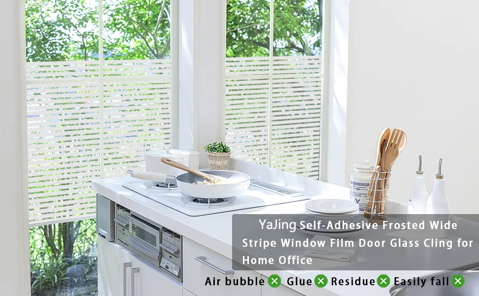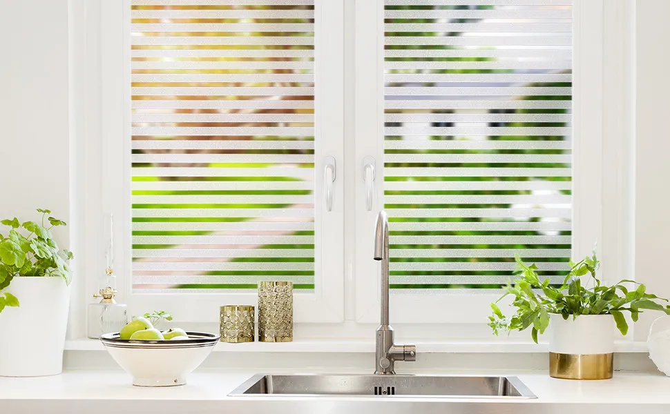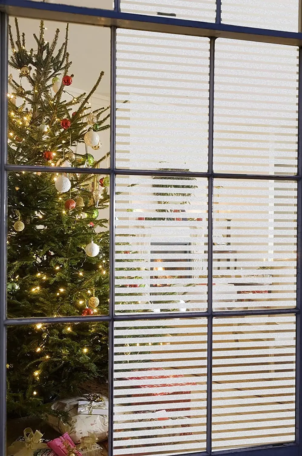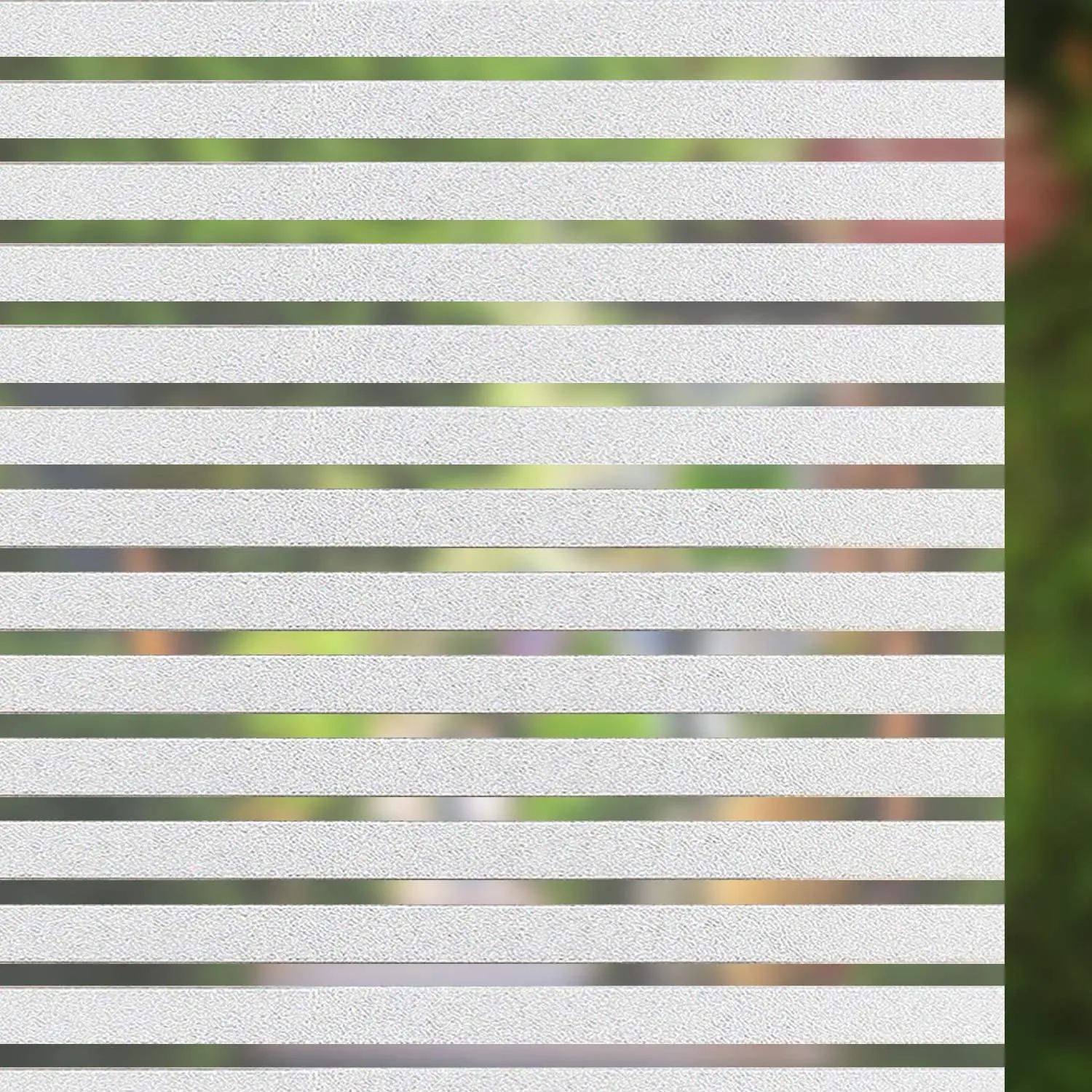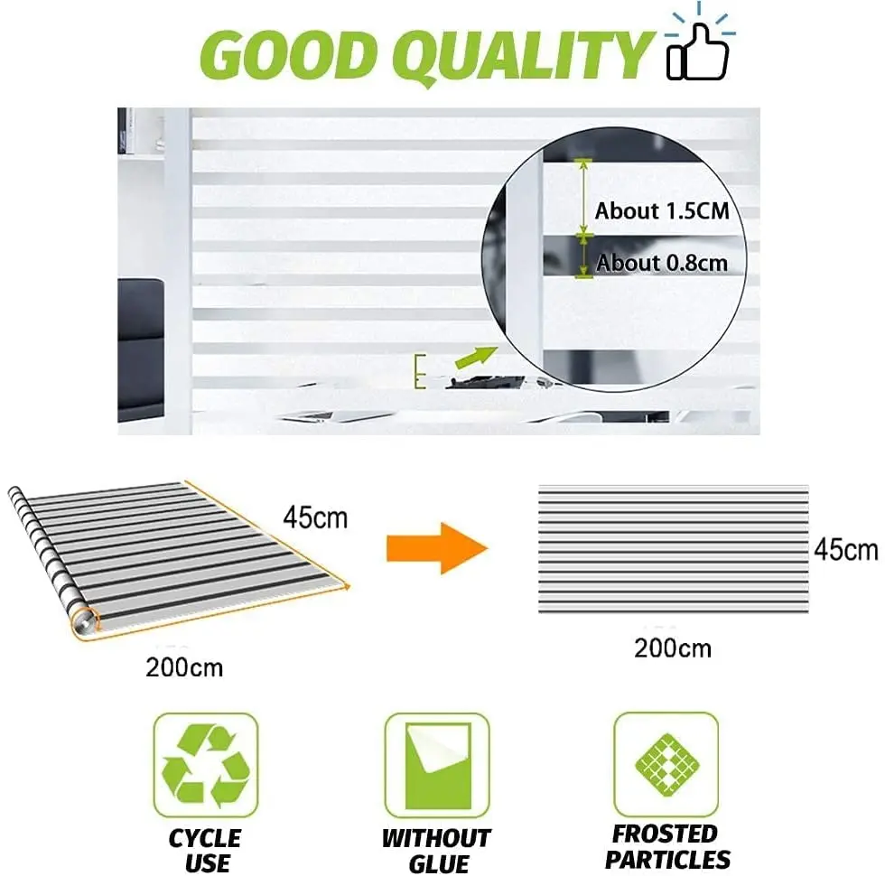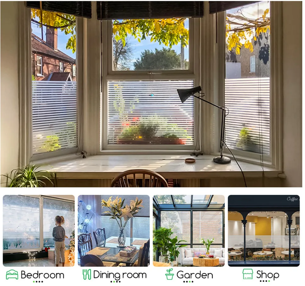 Ochrona półprywatna:1.5cm szerokości biały matowy pasek i 0.8 cm szerokości przezroczysty drobny wzór w paski, tworząc bezpieczne i kontrolowane pół prywatności środowiska. Odporność na promieniowanie UV bez wpływu na oświetlenie.