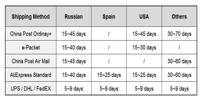 W przypadku 80% krajów, gdy twoje zamówienie przekracza 120 USD, wysyłamy je za pośrednictwemSzybkie ekspresowe, Takich jak DHL |