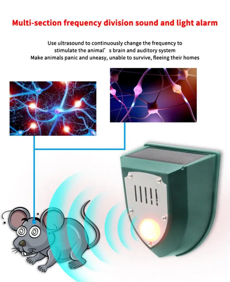 Ładowanie słoneczne i długie godziny pracy-po pełnym naładowaniu w świetle słonecznym sygnał dźwiękowy może działać przez około 30 dni. Bez obaw zabrakło mocy. Unikalne 4 tryby: ① 24 godziny z lampą błyskową i alarmem wysokiej częstotliwości ② w nocy z lampą błyskową i alarmem wysokiej częstotliwości ③ 24 godziny z lampą błyskową i alarmem ④ w nocy z lampą błyskową i alarmem