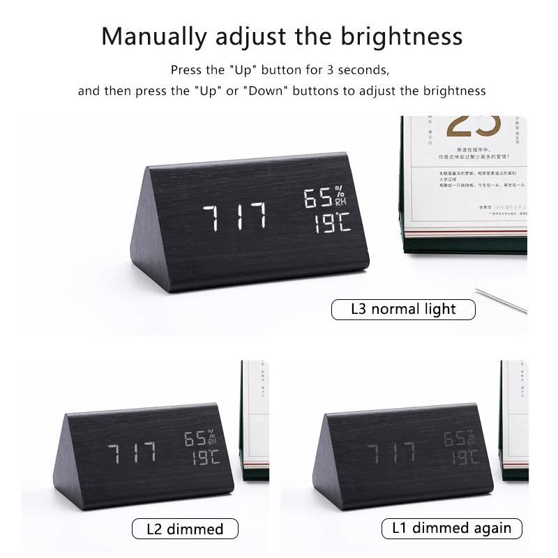 Naciśnij przycisk „UP” przez 3 sekundy, a następnie naciśnij „UP” lub „DOWN”, aby dostosować jasność