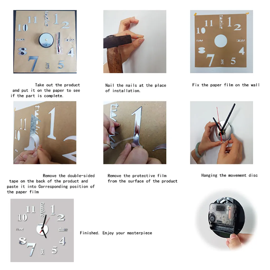 100% nowy produkt, powierzchnia zegara ma folię ochronną, proszę oderwać po instalacji. Uwaga: proszę nie instalować wskaźnika godziny i wskaźnika minuty bardzo mocno, jeśli