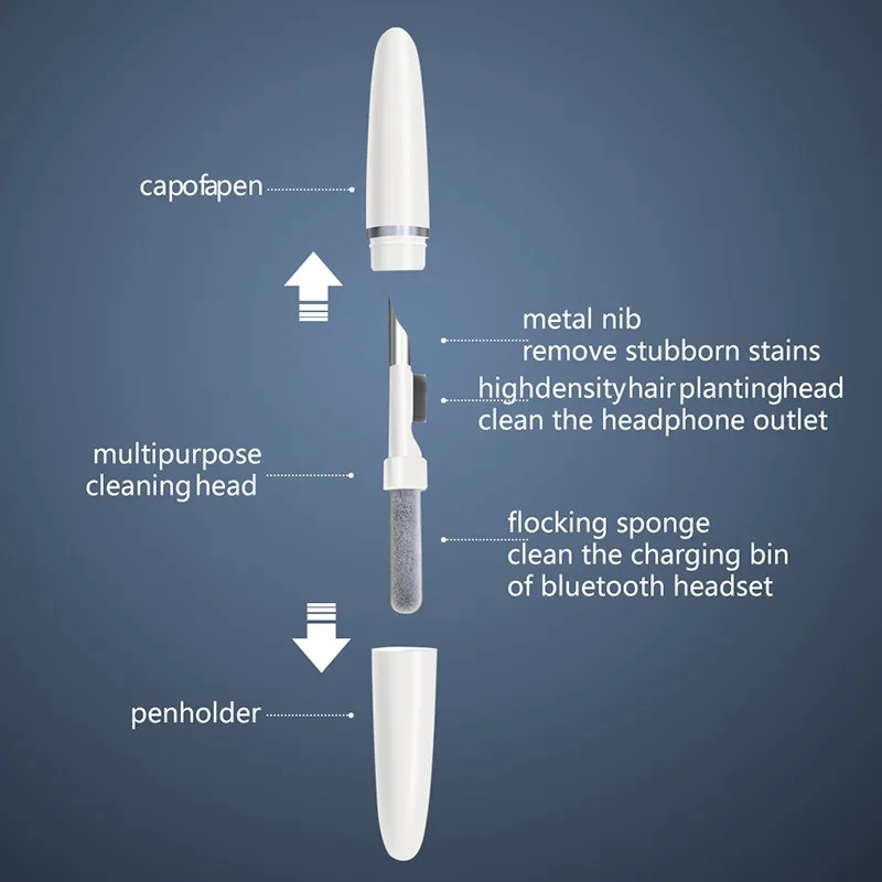 Konstrukcja w kształcie długopisu, łatwa do przenoszenia. Może być używany w dowolnym miejscu i czasie. Może być również używany do czyszczenia słuchawek, telefonów komórkowych, tabletów, aparatów fotograficznych itp.