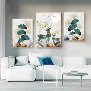 Skandynawski abstrakcyjny krajobraz Deer Decor plakat na ścianę złoty łoś liść płótno wnętrze obrazy na ścianie zdjęcia artystyczne do pokoju Home