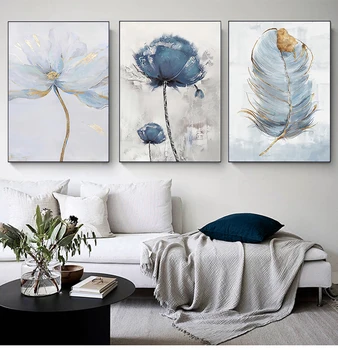 Skandynawski abstrakcyjny jasnoniebieski kwiat na płótnie malarstwo piórkowe plakaty i druki obraz ścienny do salonu Home Decor Cuadros